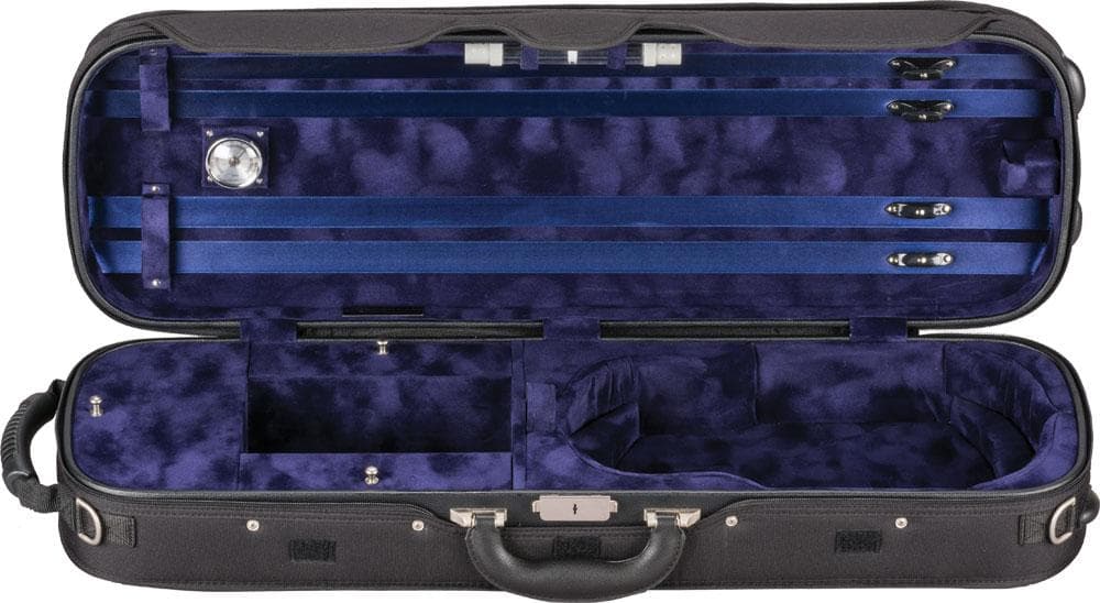 Inside your case you will find three large accessory pockets, four bow spinners and a string tube. Your violin is protected by an extra deep Suspensionair cushion. Velcro neck closure and matching silk plush blanket. For 4/4 violin, weighs 7.25 pounds.