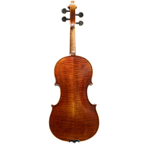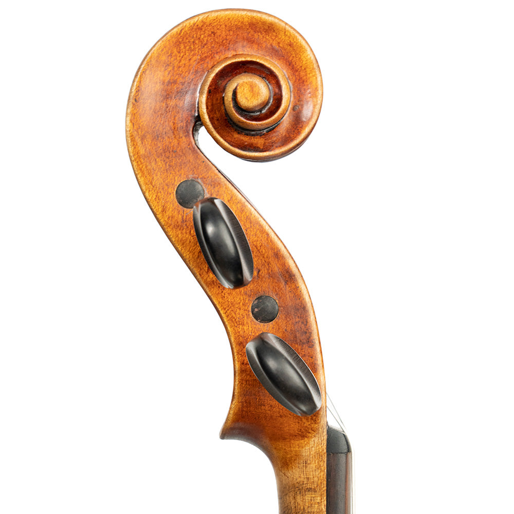 The back is of two pieces of maple, cut on the quarter of narrow width flame ascending from the center joint. The ribs and scroll are of similar maple. The top is of two pieces of spruce cut on the quarter of fine width grain widening slightly at the flanks. The varnish is red-orange over a golden ground.