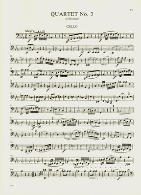 This collection includes three string quartets for two violins, viola, and cello. It consists of four instrument parts, each binding together that instruments part for all three quartets. There is no score included. The green cover is a paper folder for containing the four separate parts. The three string quartets include: