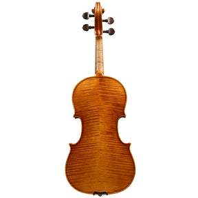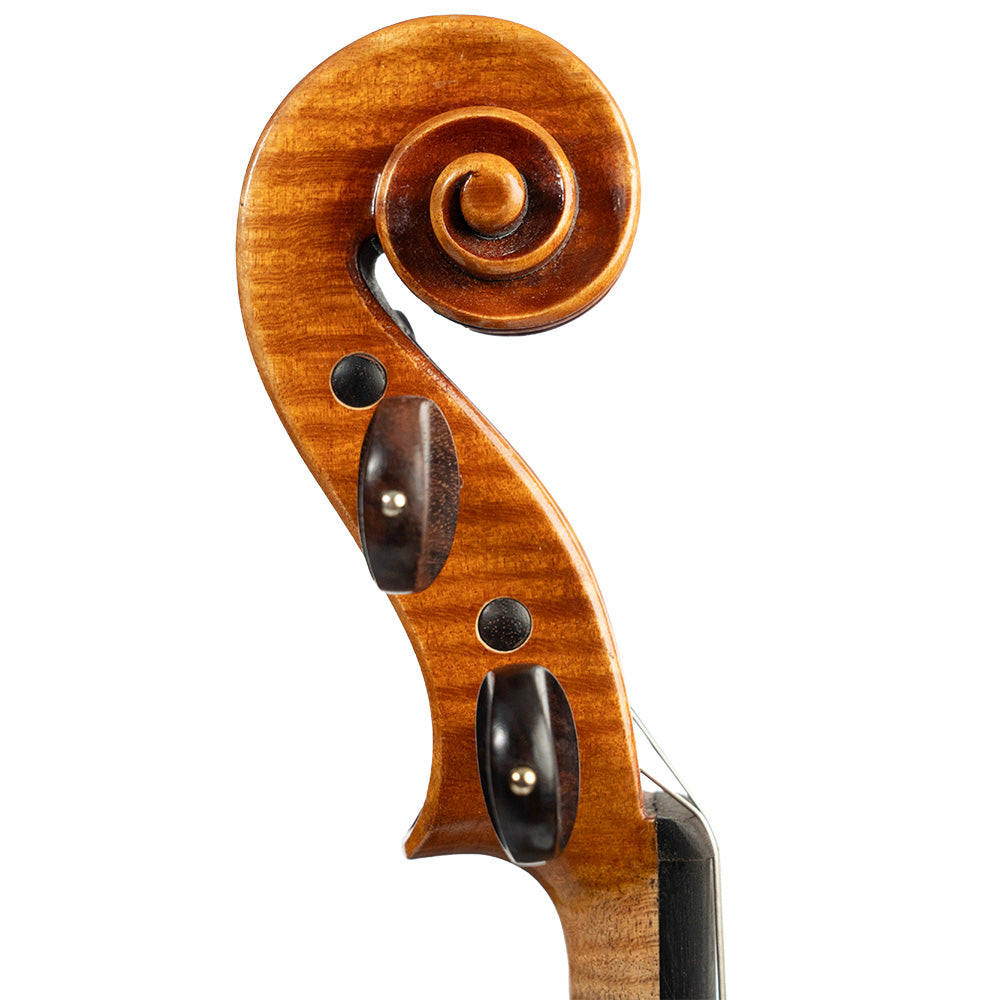 The back is of two pieces of maple cut on the quarter of narrow width flame descending from the center joint. The ribs and scroll are of similar maple. The top is of two pieces of spruce cut on the quarter of irregular width grain. The varnish is of orange-brown over a golden ground.
