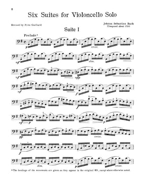 Composed by Johann Sebastian Bach, edited by Fritz Gaillard, for solo cello. Includes performance notes and introductory text. Published by G. Schirmer..