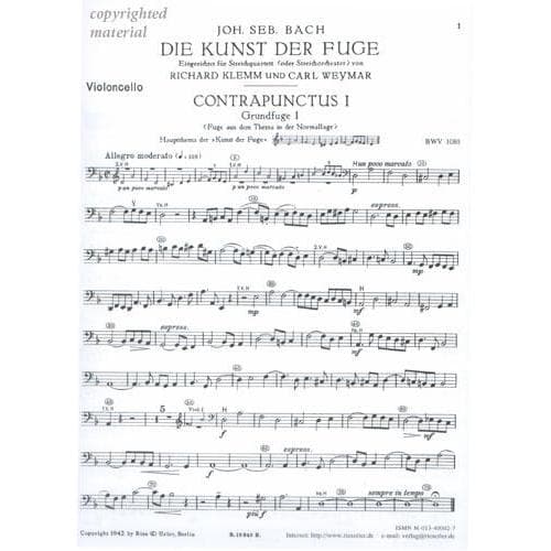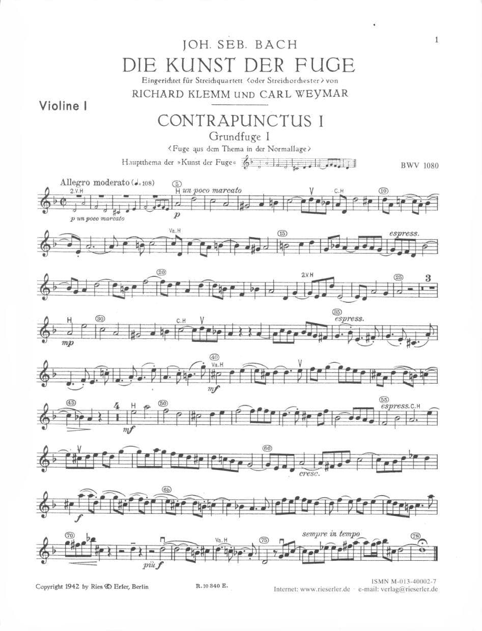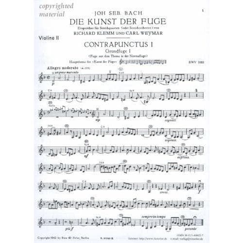 Bach, JS - Art of The Fugue BWV 1080 - Set of Parts - Arranged by Klemm-Weymar - Fischer Edition
