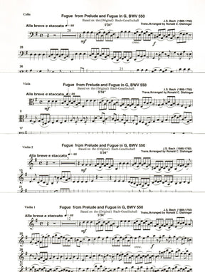 This intermediate level string trio is an arrangement by Ronald Dishinger of J.S. Bach's Fugue in G major, BWV 550. It includes one copy of each of the three parts (each printed on one side of a single page), as well as the bound score booklet. The complexity of the music without much advanced technique makes this arrangement great for intermediate student recitals or solo and ensemble competitions.