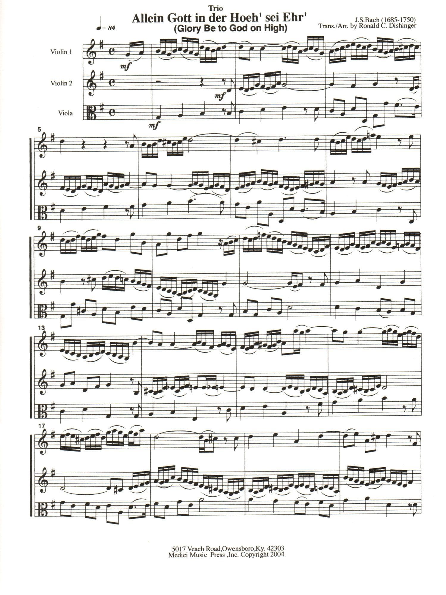Bach, J.S. - Glory Be to God on High - for Two Violins and Viola - arranged by Dishinger - Medici Music Press