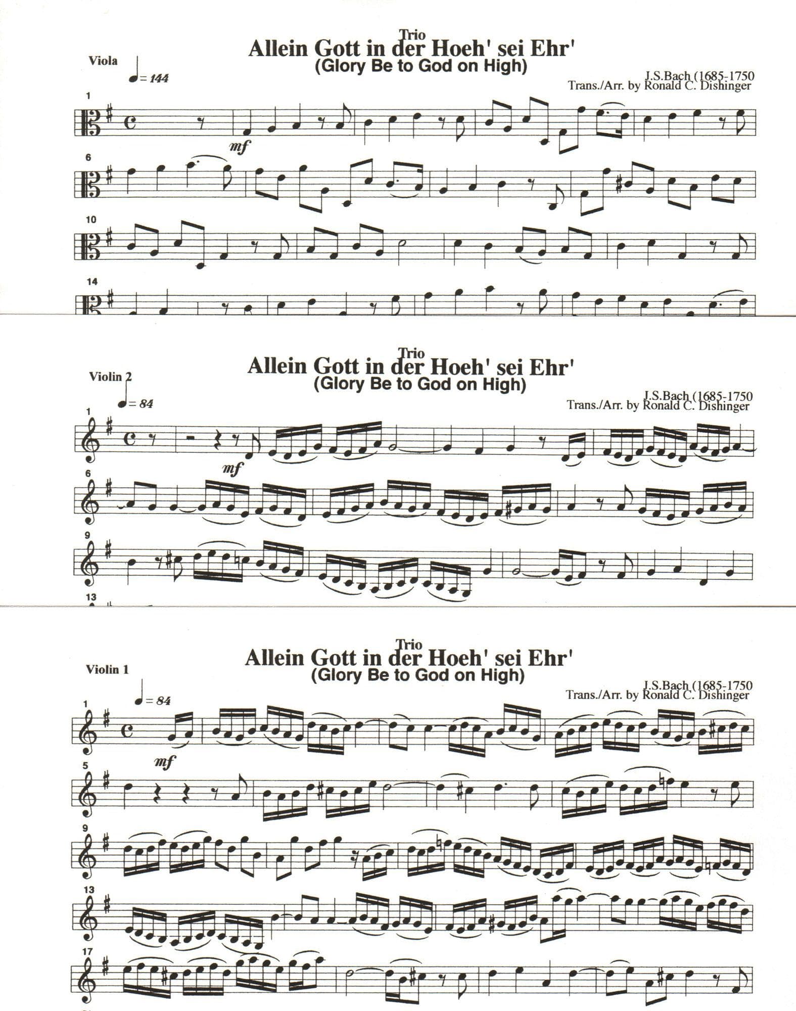 This challenging intermediate level string trio is an arrangement by Ronald Dishinger of J.S. Bach's Glory Be to God On High. It includes one copy of each of the three parts, as well as the bound score booklet. The complexity of the music make these great for intermediate student recitals or solo and ensemble competitions, as well as church or worship services. The viola part is slightly easier than the violin parts.