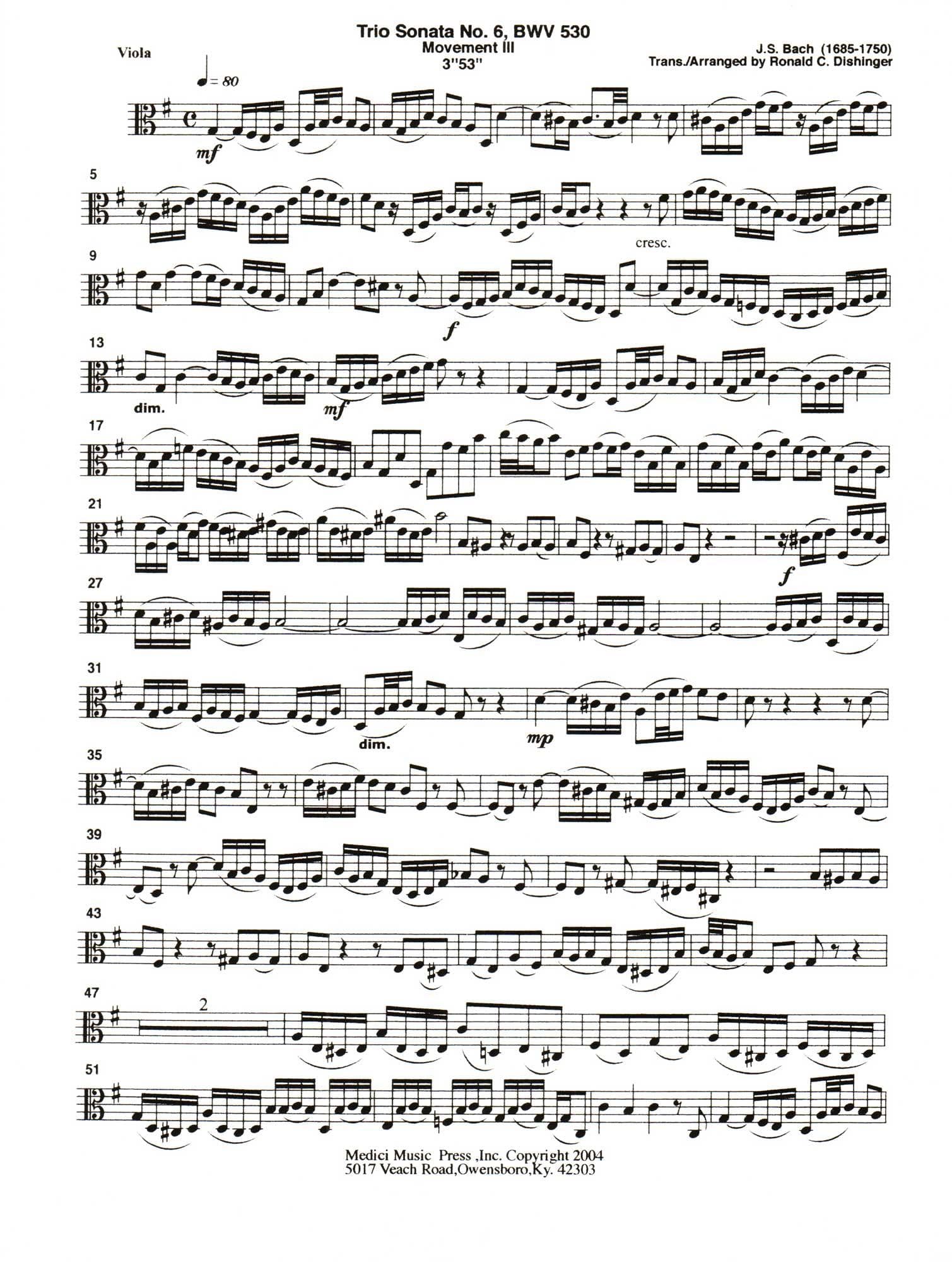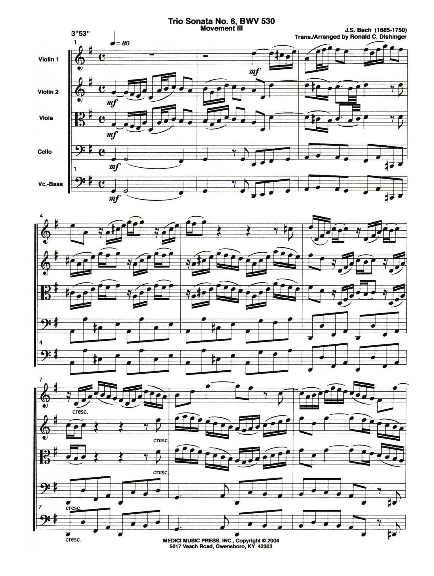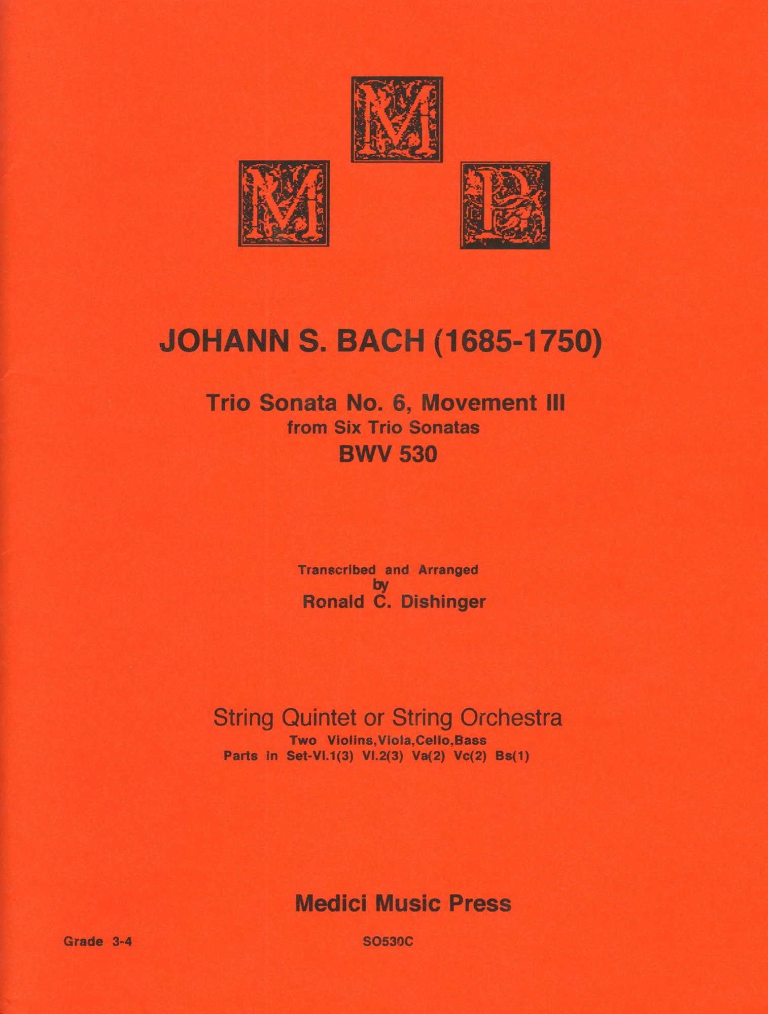 Bach, J.S. - Trio Sonata No. 6, Mvt. III, from BWV 530 - for String Quintet or Orchestra - transcribed by Dishinger - Medici Music Press