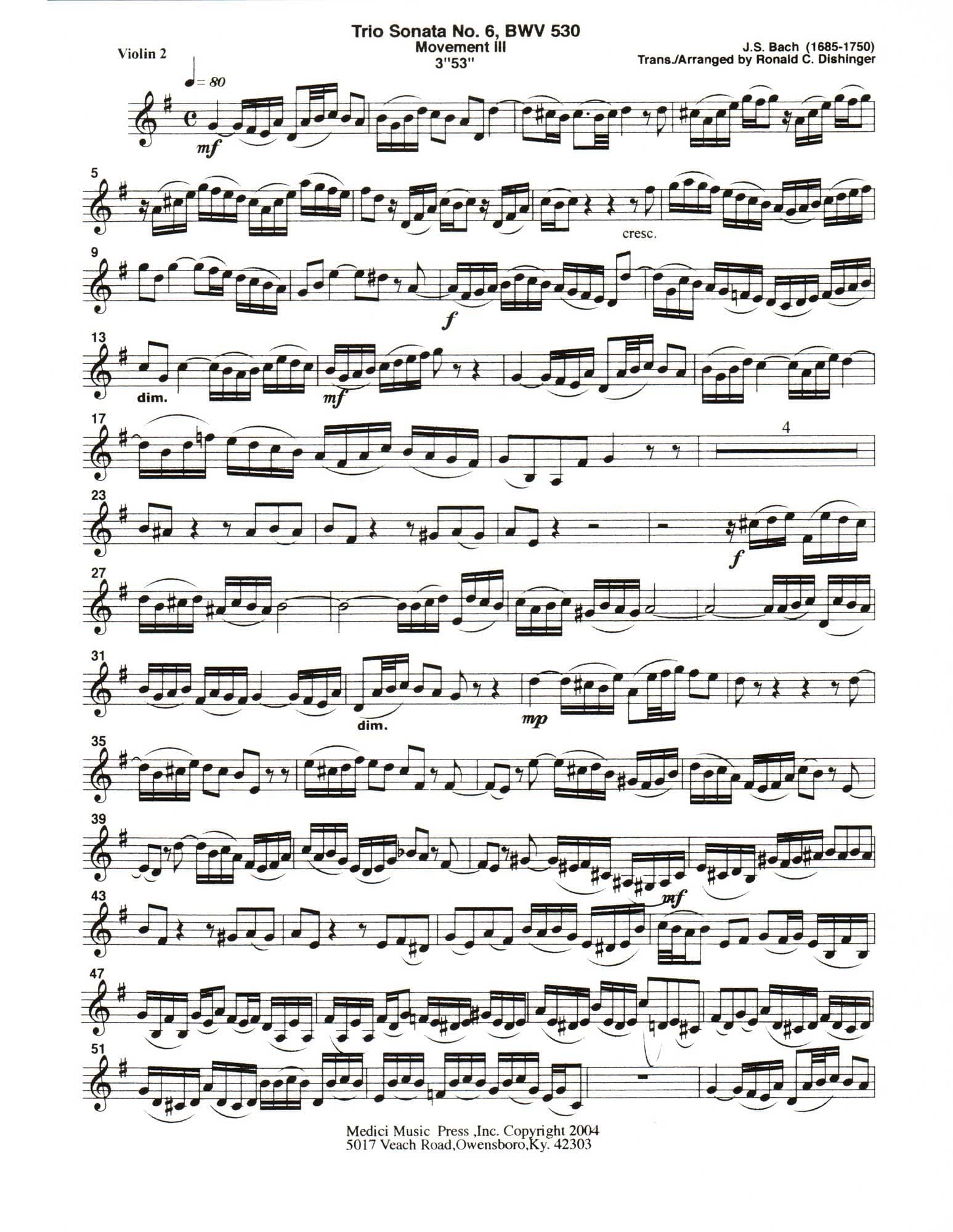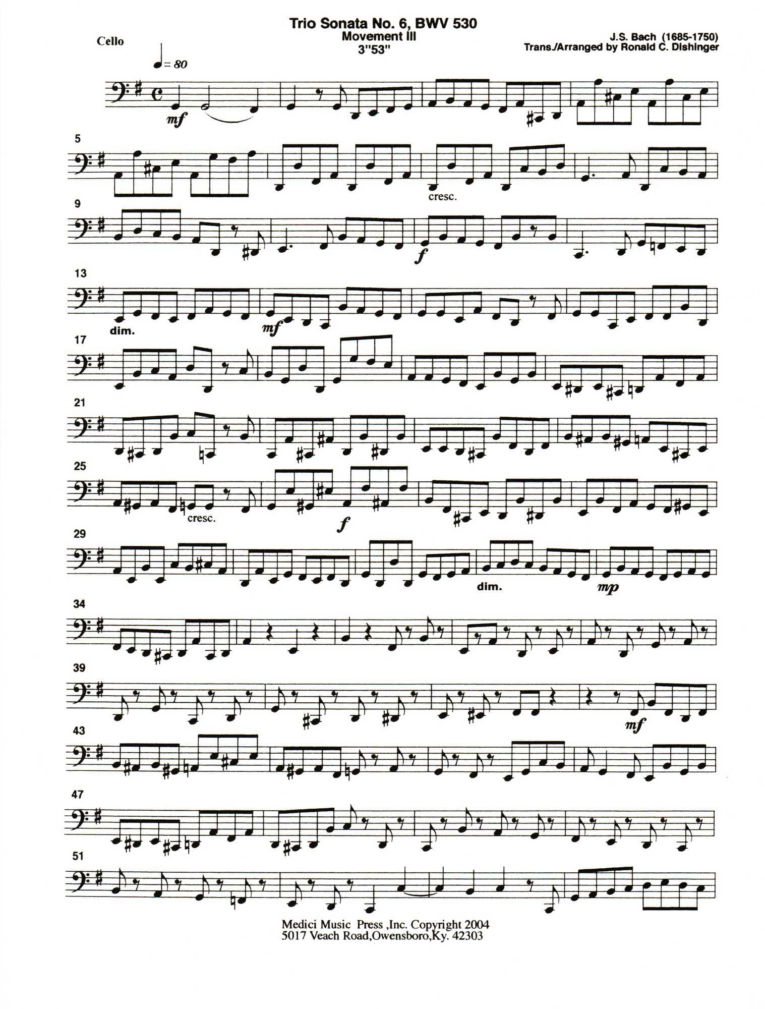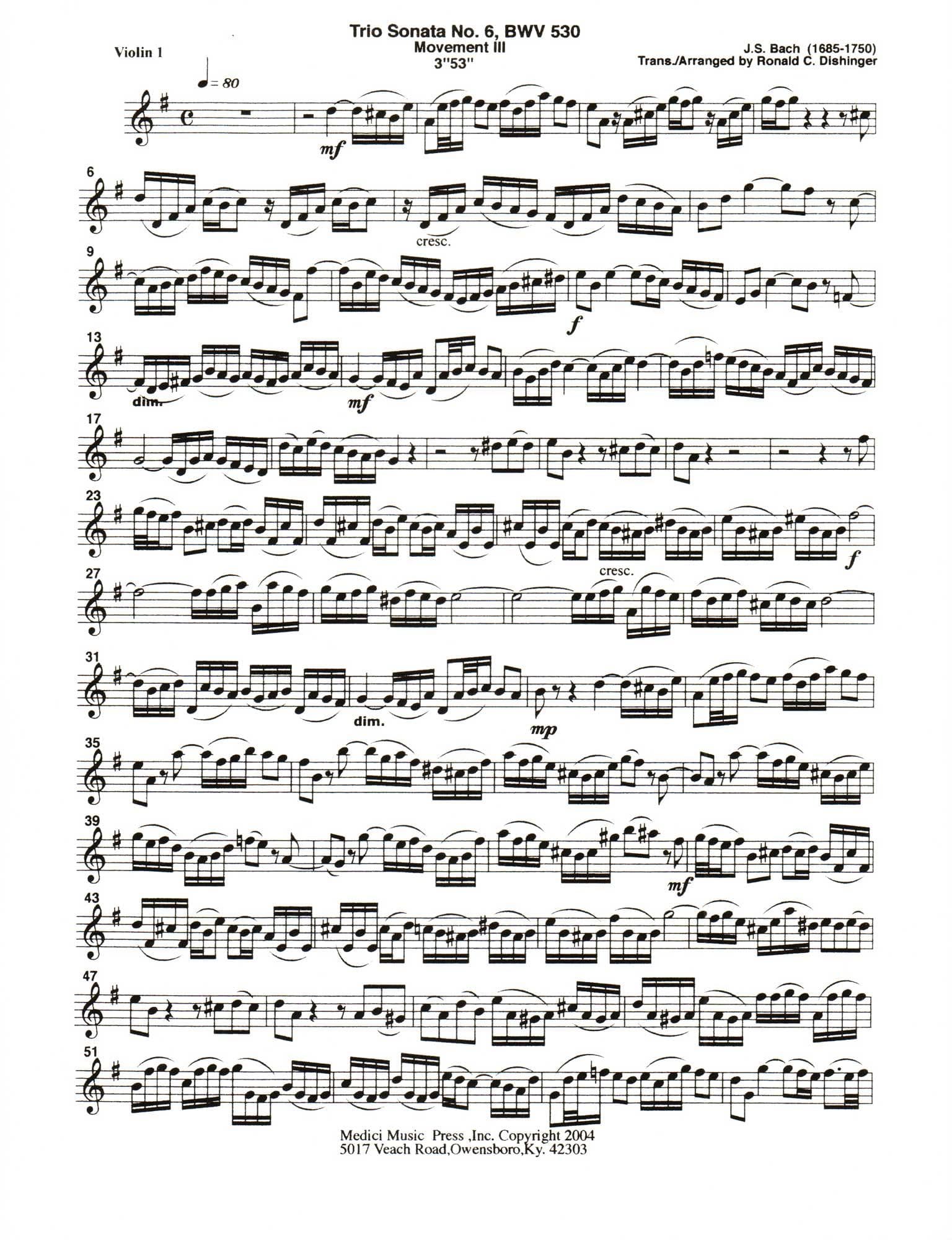 Bach, J.S. - Trio Sonata No. 6, Mvt. III, from BWV 530 - for String Quintet or Orchestra - transcribed by Dishinger - Medici Music Press