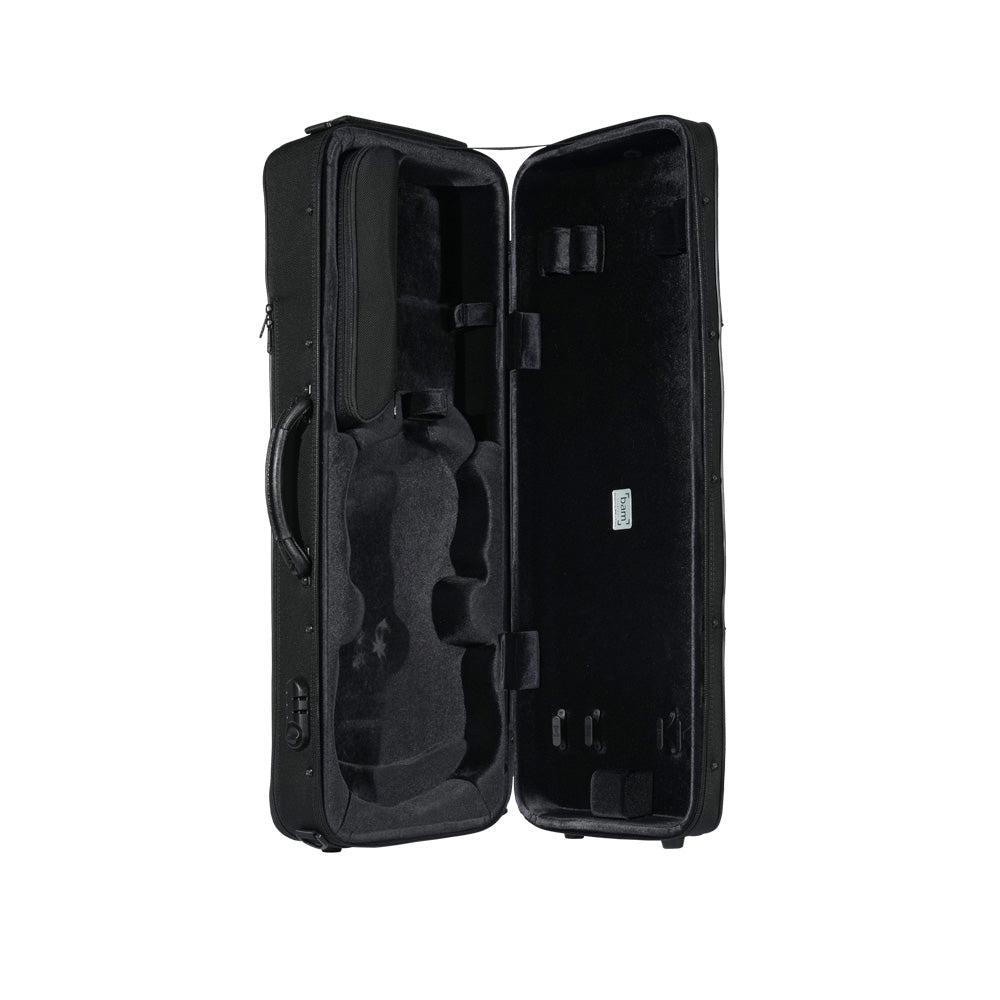 BAM quality and classic elegance and flair, at an affordable price! Original poly foam shell, with slight "give," helps absorb shock and insulates from the elements. Durable water-resistant ballistic fabric cover, removable backstraps, expandable sheet music pocket, removable accessory pouch, two bow holders. Black interior.