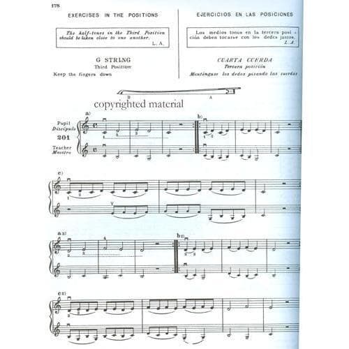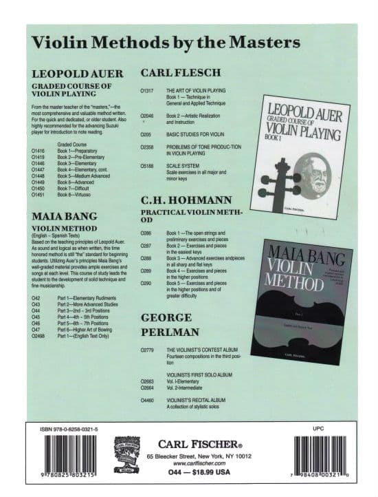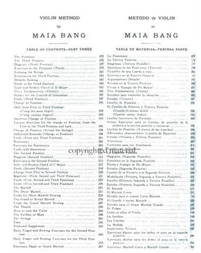 Maia Bang Violin Method provides essential methods for violin students including scales, etudes, songs, bowing exercises, etc. Each lesson has a short text in both English and Spanish to explain the way to practice. A teacher's part underneath the pupil's part is also provided for harmonic training.