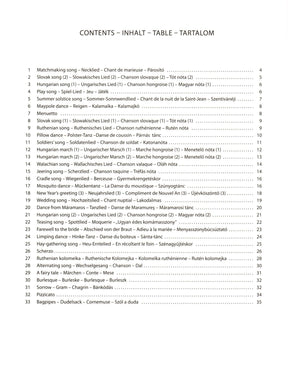 Each of these duos - with the two indicated exceptions - incorporates a peasant melody as the principal theme. They are arranged here in order of progressive difficulty. At a recital, naturally, this order should not be maintained; it would be more to the point if the pieces selected for performance were arranged into one or more (related) series and the pieces within each series played attacca. The few plans below are intended only as examples of such grouping arrangements.
