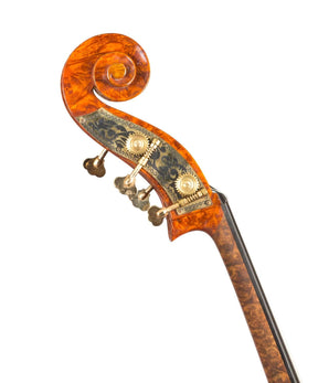 This bass, of Chinese origin, was hand-picked by our staff on a recent trip to Beijing. The bass is made from a stunning selection of Birdseye maple wood, used on the ribs, back and scroll along with a solid spruce top. The finely aged wood, along with the hand applied spirit varnish make for an instrument that is an excellent showpiece for the advanced student. The bass is professionally set up in our Ann Arbor shop with Pirastro Flexocor Deluxe strings, High quality geared tuners and the New Harmony Endpin. The rich and developed sound from this instrument is sure to impress as much as the wood selection! A unique one of a kind instrument!