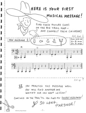This is a string crossing game with an American Wild West theme. The technical aim is to achieve clean, clear string crossing through exercises presented in a graded order. Young cellists receive these exercises in the form of messages and clues, and then plot their progress on a trail map until they reach Tex Neek's hideaway and receive an award. There are copious illustrations on "cowboy and Indian" themes by Shirley Givens and Grandpa Fred Givens.