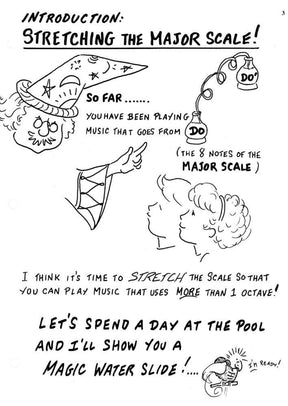 Book 3B, Stretching the Major Scale, 'stretches' the Major scale by combining the close 1-2 and close 2-3 finger patterns. The "Violinland Olympics" reviews basic posture. 6/8 time is introduced through body movement. There is more singing and playing in harmony, conducting, note-reading and note-writing. There are also several violin stunt songs for fun learning.