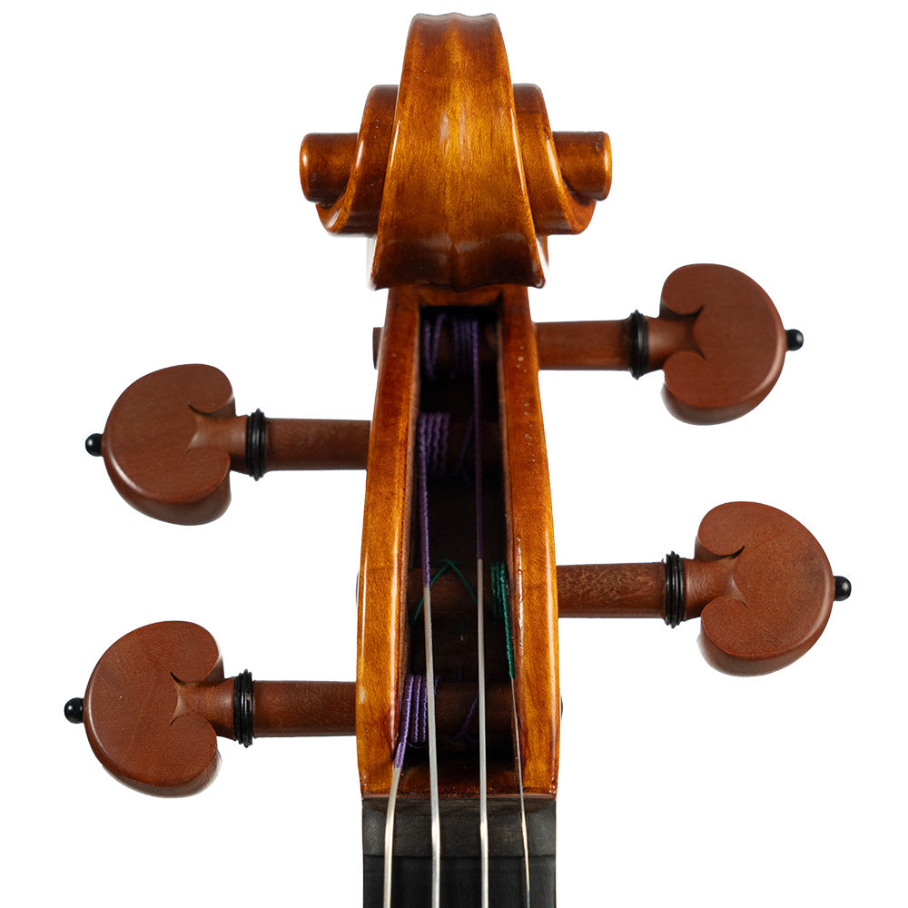 Modeled on a famous 1715 Stradivari, this violin has been made with carefully aged, flamed maple back, neck and scroll and seasoned European spruce tops. Carefully applied hand varnish, following traditional Italian methods, the Classic employs four coats of varnish, dried naturally in the sun, bringing out the full beauty of the violin, both aesthetically and tonally. Quality fittings used throughout, including a hand carved bridge, Hill-style boxwood pegs, and a boxwood tailpiece with fine tuner for the E-string.