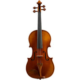 Modeled on a famous 1715 Stradivari, this violin has been made with carefully aged, flamed maple back, neck and scroll and seasoned European spruce tops. Carefully applied hand varnish, following traditional Italian methods, the Classic employs four coats of varnish, dried naturally in the sun, bringing out the full beauty of the violin, both aesthetically and tonally. Quality fittings used throughout, including a hand carved bridge, Hill-style boxwood pegs, and a boxwood tailpiece with fine tuner for the E-string.