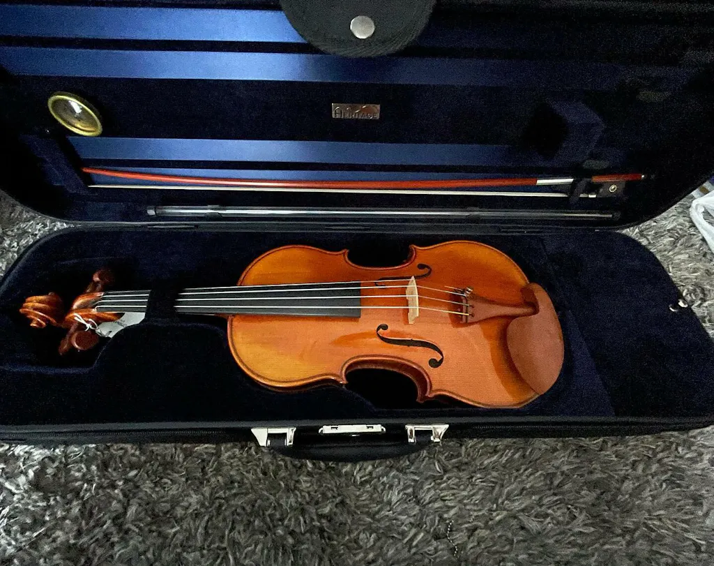 Modeled on a famous 1715 Stradivari, this violin has been made with carefully aged, flamed maple back, neck and scroll and seasoned European spruce tops. Carefully applied hand varnish, following traditional Italian methods, the Classic employs four coats of varnish, dried naturally in the sun, bringing out the full beauty of the violin, both aesthetically and tonally. Quality fittings used throughout, including a hand carved bridge, Hill-style boxwood pegs, and a boxwood tailpiece with fine tuner for the E-string.