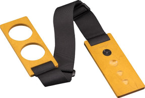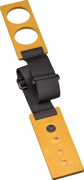 In this redesigned endpin stop, a flexible strap connects two hardwood pieces, one held by your chair leg. While earlier models relied on staples to keep the hardwood pieces firmly secured to the strap, this model uses heavy-duty stitching.