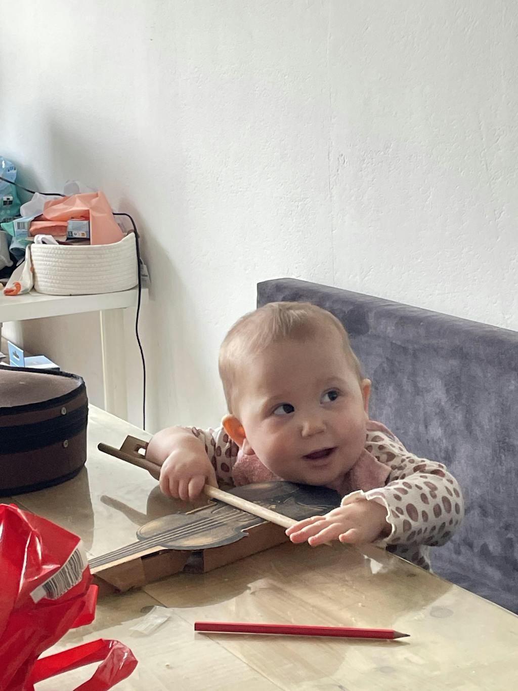 This 1/16 size Pre-Twinkle Box Violin and bow set comes with a realistic-looking corrugated cardboard violin with an authentic-looking (hairless) wood bow with frog. Perfect for a budding violinist!
