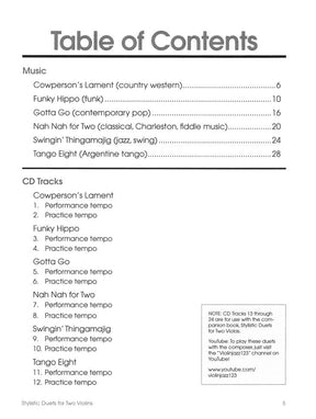 These spirited and whimsical violin duets are musically motivating and technically challenging. Explore bowing techniques and stylistic playing in popular genres from coyboy swing through blues and funk and back to classical. Also appropriate as performance pieces. Includes performance notes.