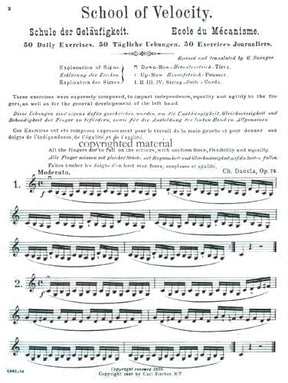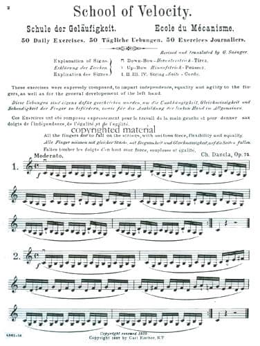 Charles Dancla's School of Velocity offers the developing violinist 50 exercises for developing left hand speed and accuracy. Each etude focuses on a particular technical element, and mastery of all fifty goes a long way toward preparing the student for future concertos or Dancla's Etudes Brillantes.