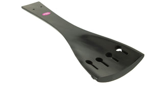 This solid ebony tailpiece with ebony fret is designed with tailgut wire holes from the front to the back of the tailpiece. This leaves the tailgut wire visible across the front of the tailpiece when installed. For tailpieces with hidden vertical holes through the back of the tailpiece, choose item 1344SPEC.