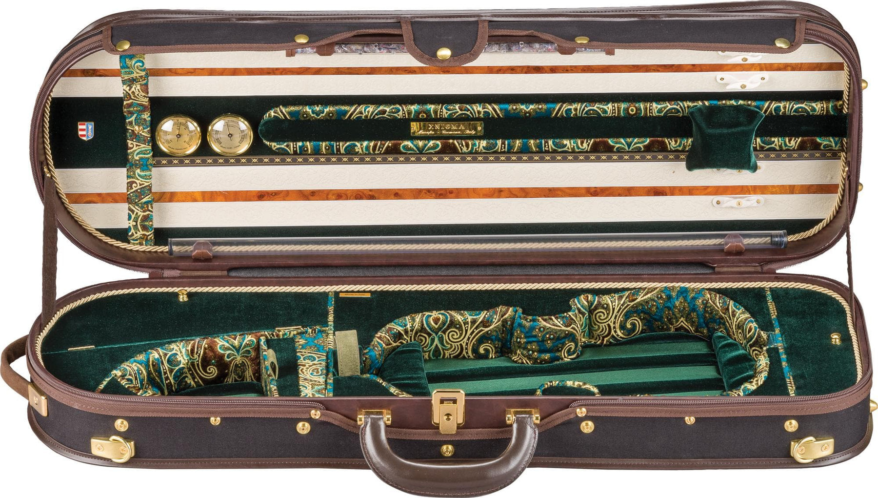 Now in its second design series, the Enigma Leggero is the same as the Musafia Enigma, except with fewer features, decreasing the price and weight. Boldly asymmetric in form, with rounded-form left side, and right angle left side. The interior of the Enigma Leggero continues on the theme, with centered violin positioning, a gracefully curved partition to accommodate violin scroll and pegs, and angled compartment doors for more storage space. Bolted-through steel L-reinforcements is an advanced safety feature for your valuable violin. Choice of Black Fantasia, Blue Fantasia, Green Fantasia, or Gray Fantasia interior fabric, with military-grade, Teflon treated Cordura black fabric cover with subway handle.