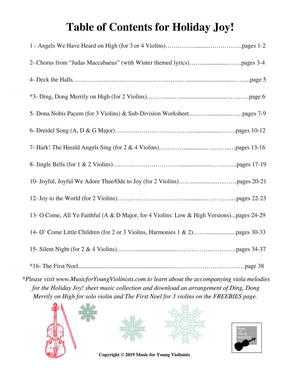HOLIDAY JOY! is an *eBook collection of 16 traditional holiday & Christmas songs offered in 32 different arrangements. These create the perfect collection of music to create a holiday performance inclusive to all levels of players in your studio. *Please visit the FREEBIES page to download an arrangement of Ding, Dong Merrily on High for solo violin and The First Noel for 3 violins.