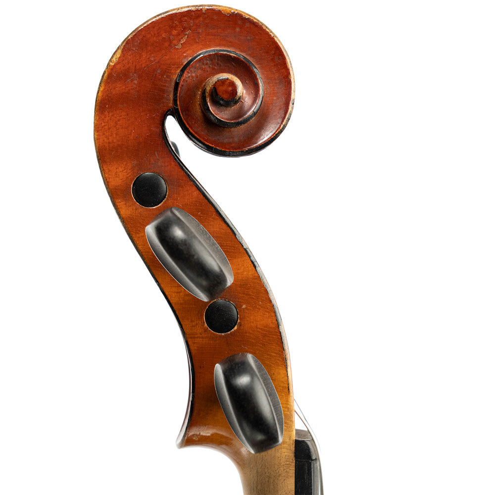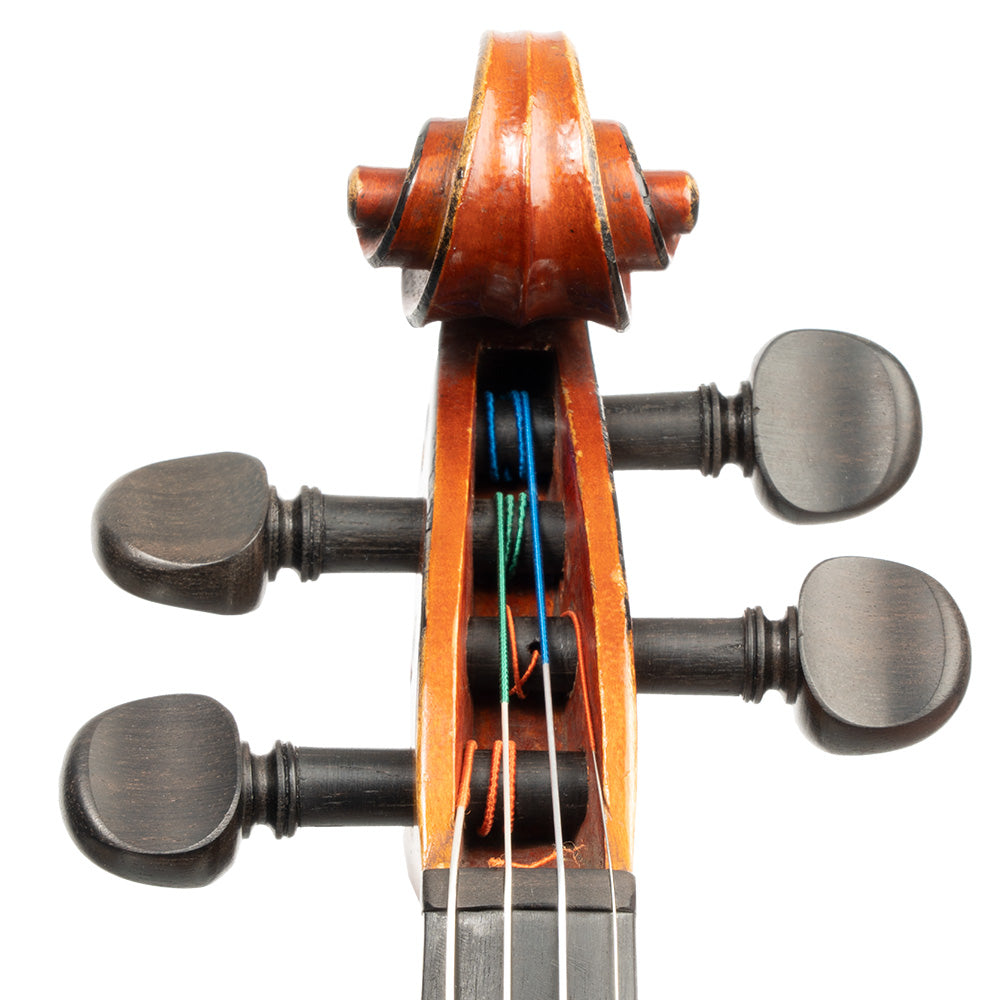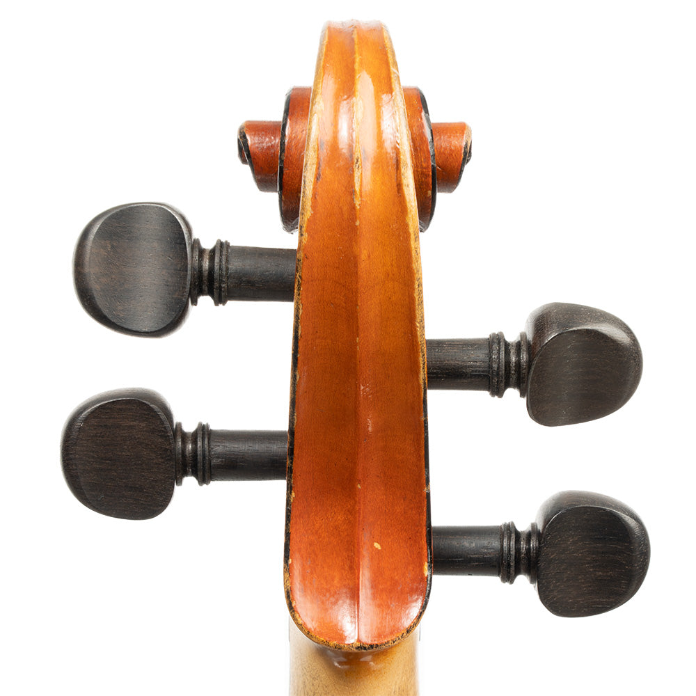 The back is of two pieces of maple cut on the quarter of narrow width flame descending from the center joint. The ribs and scroll are of similar maple. The top is of two pieces of spruce cut on the quarter of medium width grain widening slightly at the flanks. The varnish is red-orange over a golden ground.
