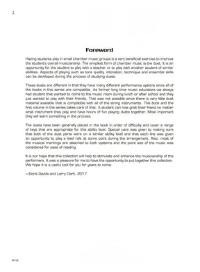 If you have a friend that plays another string instrument and you want to play a duet with them for fun or in a performance, then this is the book for you. This collection contains twenty-nine duets in a variety of styles from classical to folk music to original pieces that will be fun to play with any combination of two string instruments. Duets are a great way to learn how to play in a chamber-music setting, and this unique collection gives you the opportunity to do it with anyone else that plays a string instrument, making the combinations of instruments that can be used almost limitless. This would be a great collection for use in a school setting, for students who are especially eager to play music with their friends. The flexibility of these duets makes them a must-have for any string player.