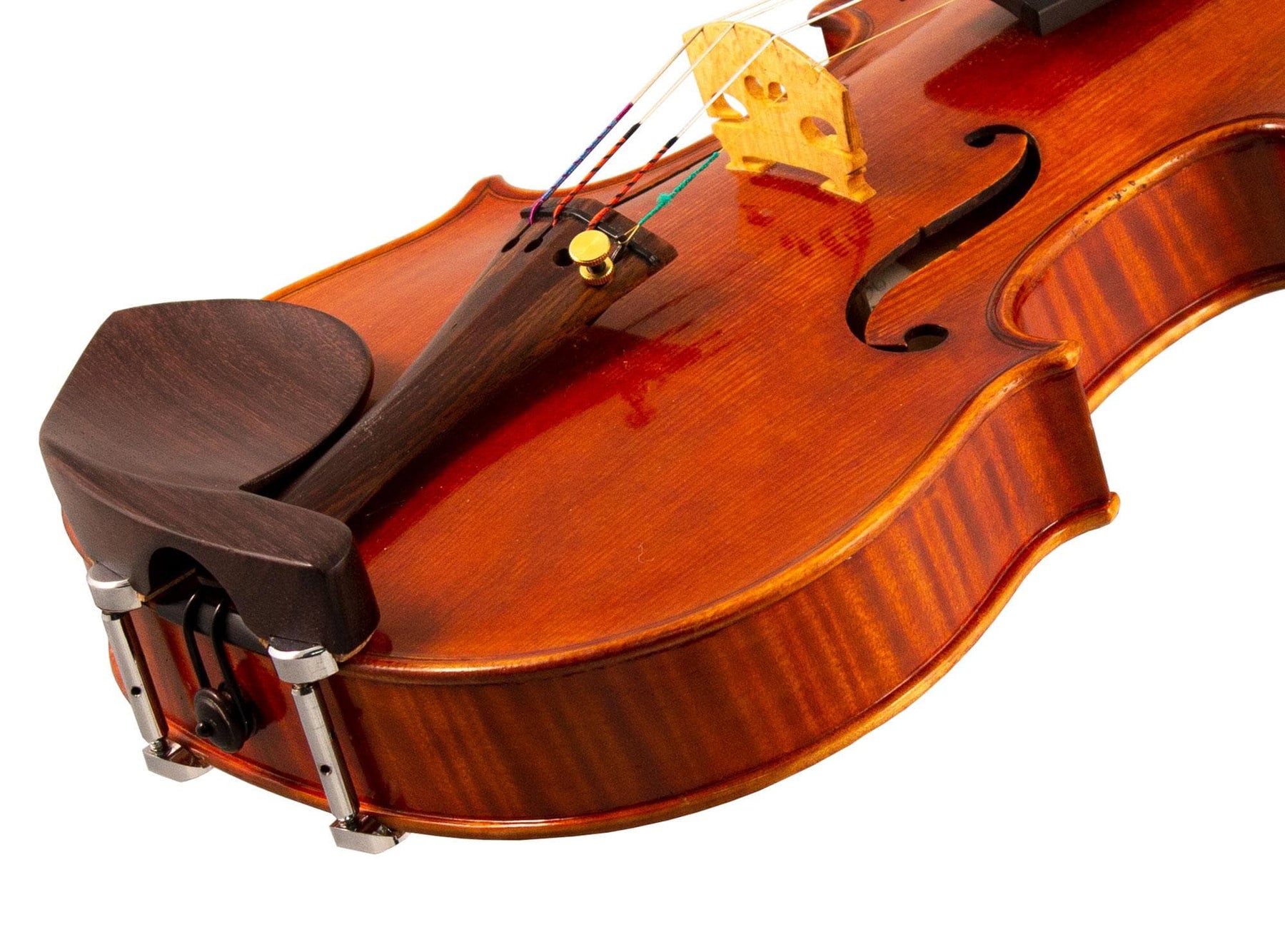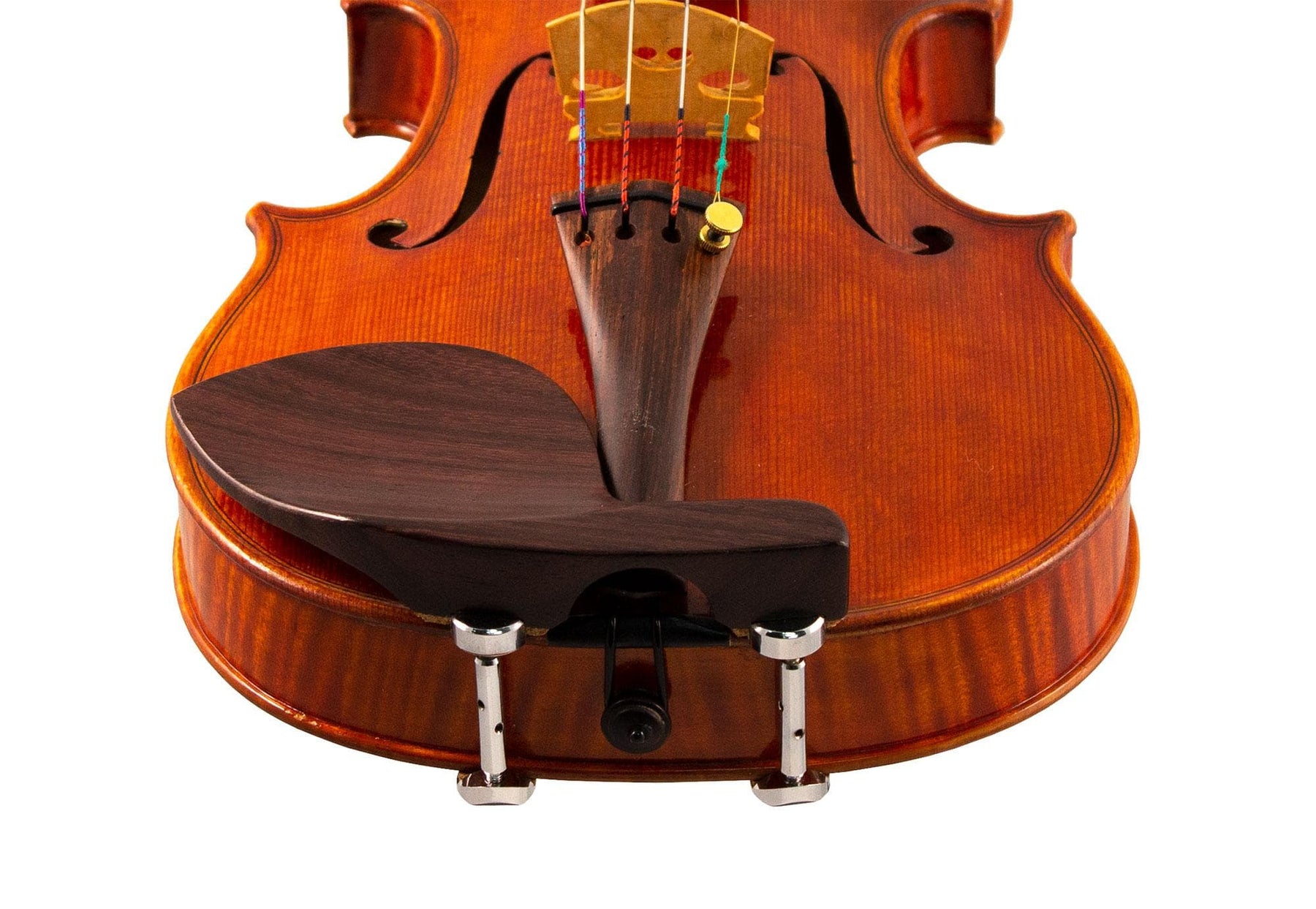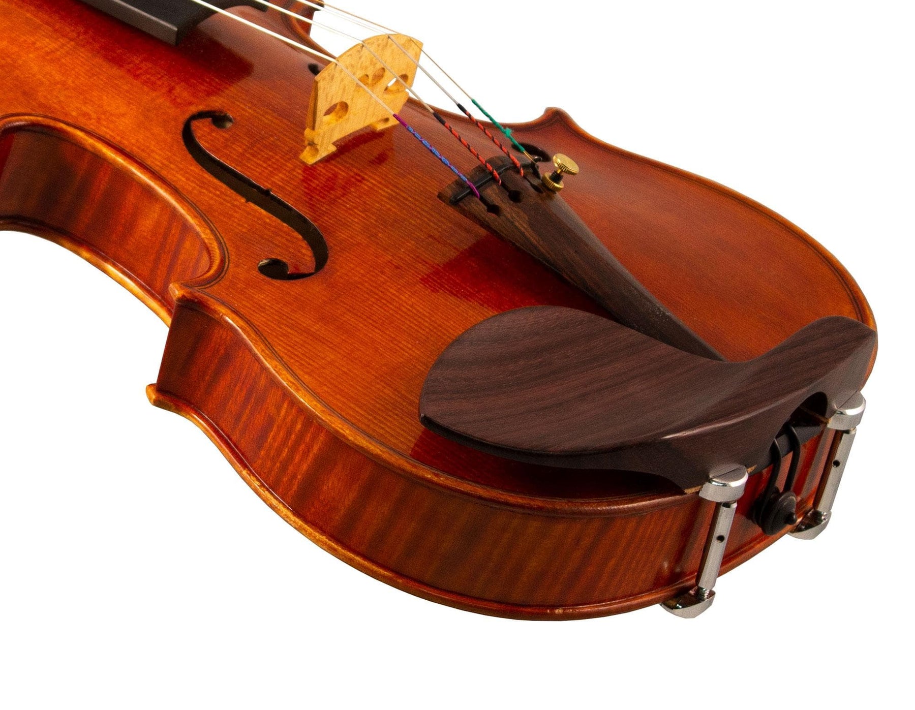 These authentic rosewood chinrests were designed based on the shape of popular 20th Century German chinrests. The Old Hill-style plate features a square corner on the opposite side of the clamp, giving it added symmetry and a more traditional look. Independently adjustable Hill-style clamps are chrome plated and allow for easy installation.