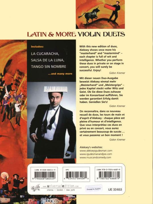 Aleksey Igudesman, one half of the musical comedy duo "Igudesman and Joo," is not only a creative violinist, but also a gifted composer. His book Latin & More contains ten advanced intermediate violin duets (originals and arrangements) in different Latin American idioms, including tango, samba, rumba, and more. Ideal for players who have a good grasp of double stops and quick position changes, these duos are both challenging and a lot of fun!