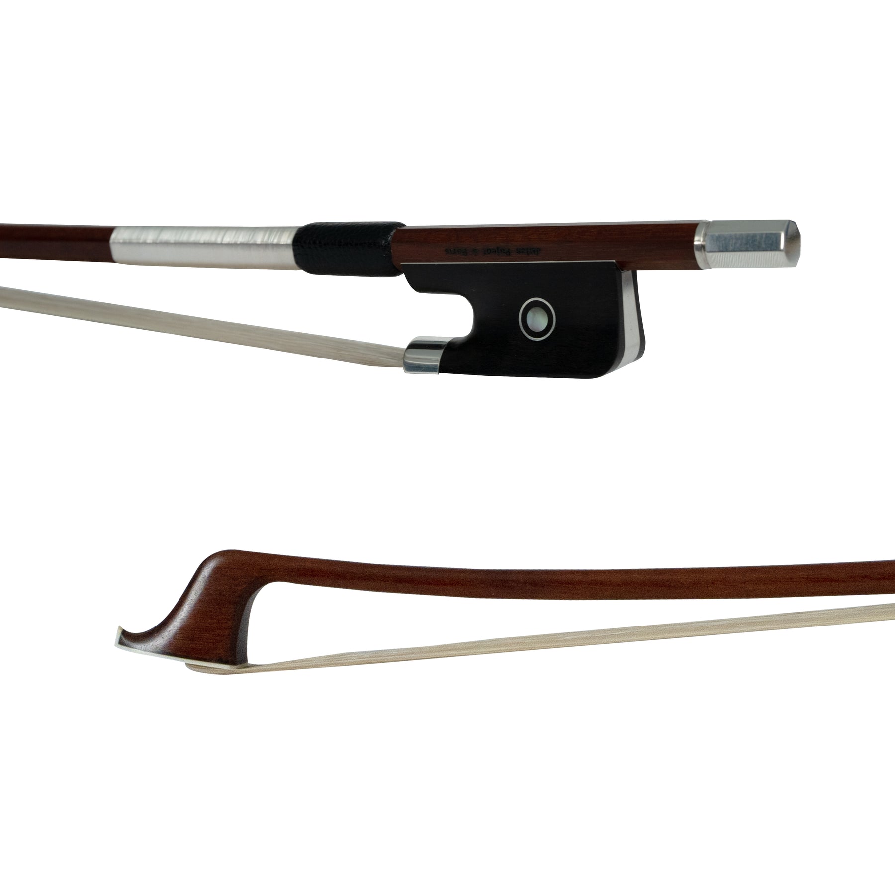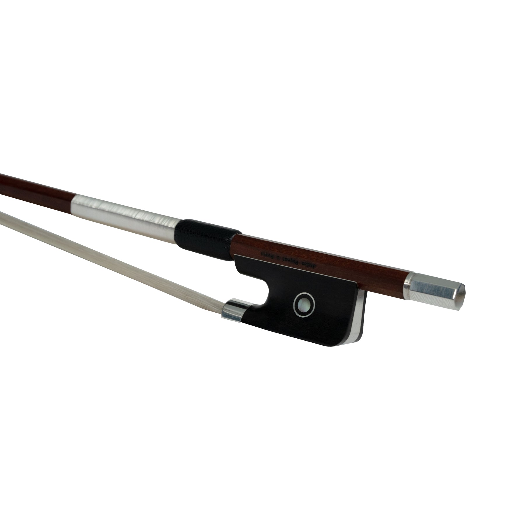 The majority of fine bow makers since the time of Francois Tourte have been French. The Jules Pajeot à Paris bow, completely handcrafted in France by a noted atelier, is a presentation exclusively from Shar which begins with pernambuco aged for over 75 years, each shaft tested for strength and flexibility. The addition of fine ebony and sterling silver to produce a beautiful and durable frog and button completes each bow before its final branding. A synthetic head plate assures easy passage through Customs and Borders inspections.
