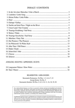 Arranged by Konstantin Fortunatow (Nos. 1, 2, 4, 6, 7, 12), Georgi Kirkor (No. 3), and Konstantin Sorokin (Nos. 5, 8, 9, 10, 11, 16, 18, 19, 20). Includes score and violin part.