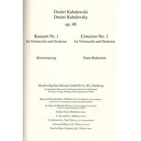 Kabalevsky, Dmitri - Concerto Number 1, Opus 49 For Cello and Piano Published by Sikorski