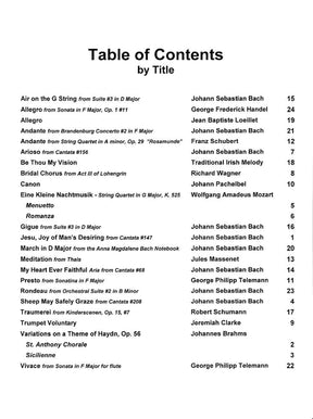 Contents: Bach/Air on the G String -- Bach/Andante from Brandenburg Concerto No. 2 in F -- Bach/Arioso -- Bach/Jesu, Joy of Man's Desiring -- Bach/March in D (from Anna Magdalena Notebook) -- Bach/My Heart Ever Faithful (from Cantata 68) -- Bach/Rondeau from Orchestral Suite No. 2 in b -- Bach/Sheep May Safely Graze -- Brahms/Variations on a Theme of Haydn, Op. 56 -- Clarke/Trumpet Voluntary -- Handel/Allegro from Sonata in F, Op. 1 No. 11 -- Loeillet/Allegro -- Massenet/Meditation from Thais -- Mozart/Romanza from Eine Kleine Nachtmusik, K. 525 -- Pachelbel/Canon -- Schubert/Andante fromQuartet in a minor Rosamunde -- Schumann/Traumerei, Op. 15 No. 7 -- Telemann/ Presto and Vivace -- Wagner/Bridal Chorus
