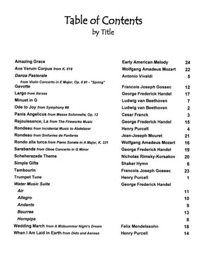Contents: Beethoven/ Minuet in G -- Beethoven/Ode to Joy (from Symphony No. 9) -- Amazing Grace -- Franck/Panis Angelicus -- Gossec/Gavotte and Tambourin -- Handel/La Rejouissanc e (from Royal Fireworks Music) -- Handel/Largo (from Xerxes) -- Handel/ Sarabande (from Oboe Concerto in g minor) -- Handel/Water Music Suite (Air, Allegro, Andante, Bourree, Hornpipe) -- Mendelssohn/Wedding March -- Mouret/ Rondeau -- Mozart/Ave Verum Corpus, K. 618 -- Mozart/Rondo alla turca (fromPiano Sonata in A, K. 331) -- Purcell/Rondeau from Abdelazer -- Purcell/Trumpet Tune -- Purcell/When I am Laid in Earth (from Dido and Aeneas) -- Rimsky-Korsakov/Scheherezade Theme (Young Prince and Young Princess) -- Simple Gifts -- Vivaldi/Danza Pastorale from Spring, Op. 8 No. 1 (Four Seasons)
