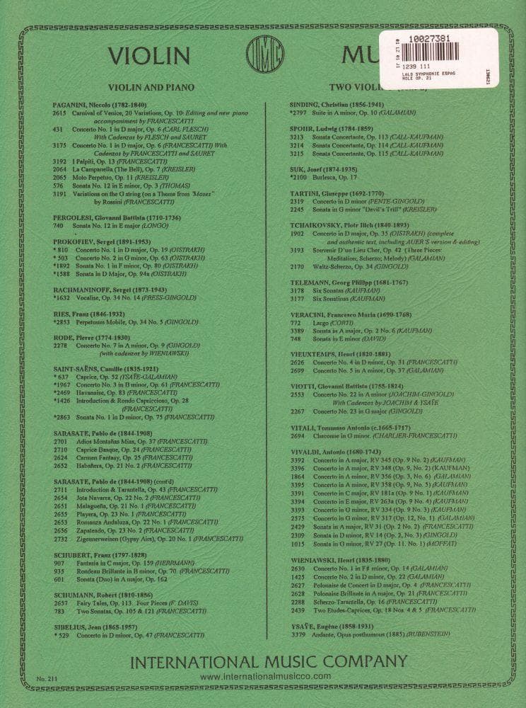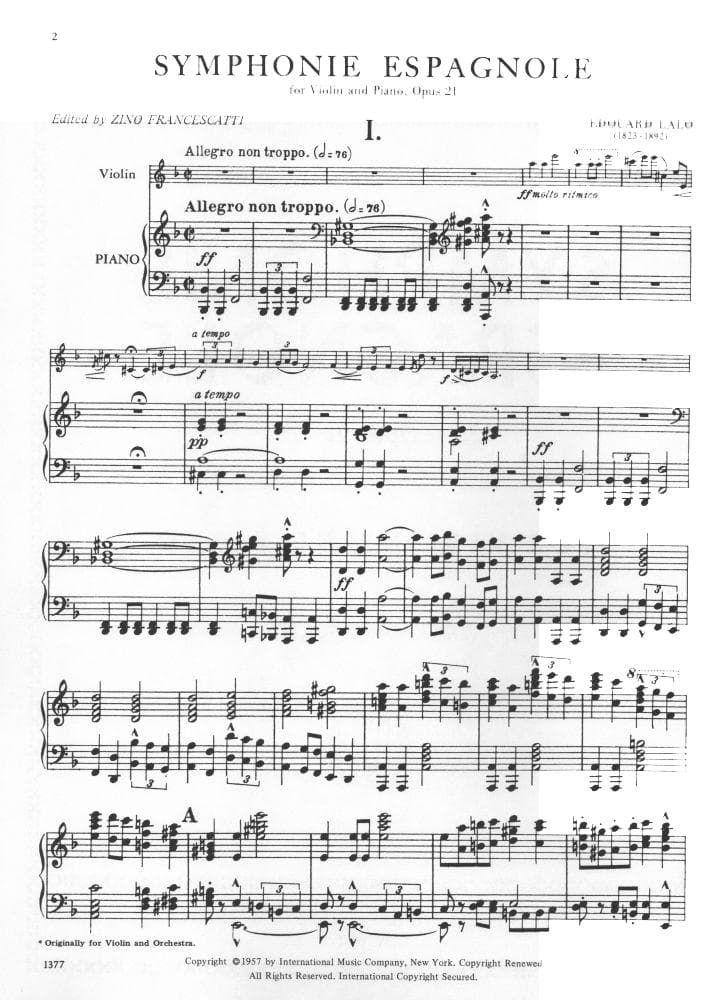 Lalo, Edouard - Symphonie Espagnole, Op 21 - Violin and Piano - edited by Zino Francescatti - International Music Co