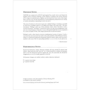 The two-movement, Vapors, was composed in 2008-09, inspired by the composer’s visit to artist Constance DeJong’s studio. Leisner was moved by her large two-paneled Nitrate Painting XVI (see here), and he has written: “You can feel enveloped by it and meditatively immersed in its cloudy or watery atmosphere, depending on how you see it. The more I looked at it, the more it gave me a similar feeling to watching a snowfall in which the snowflakes appear to be falling and rising at the same time. The first movement, Falling, came out of this sensation. Later, when I decided to add a second movement, Floating, I turned the work on its side in my imagination, and now saw a broad expanse of clouds or ocean, with spatial depth that was accompanied by a sense of depth of time. This image spawned the second movement.”