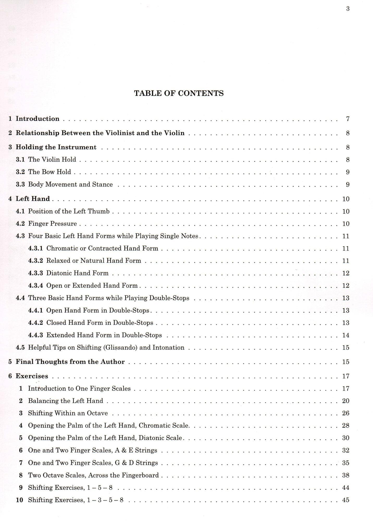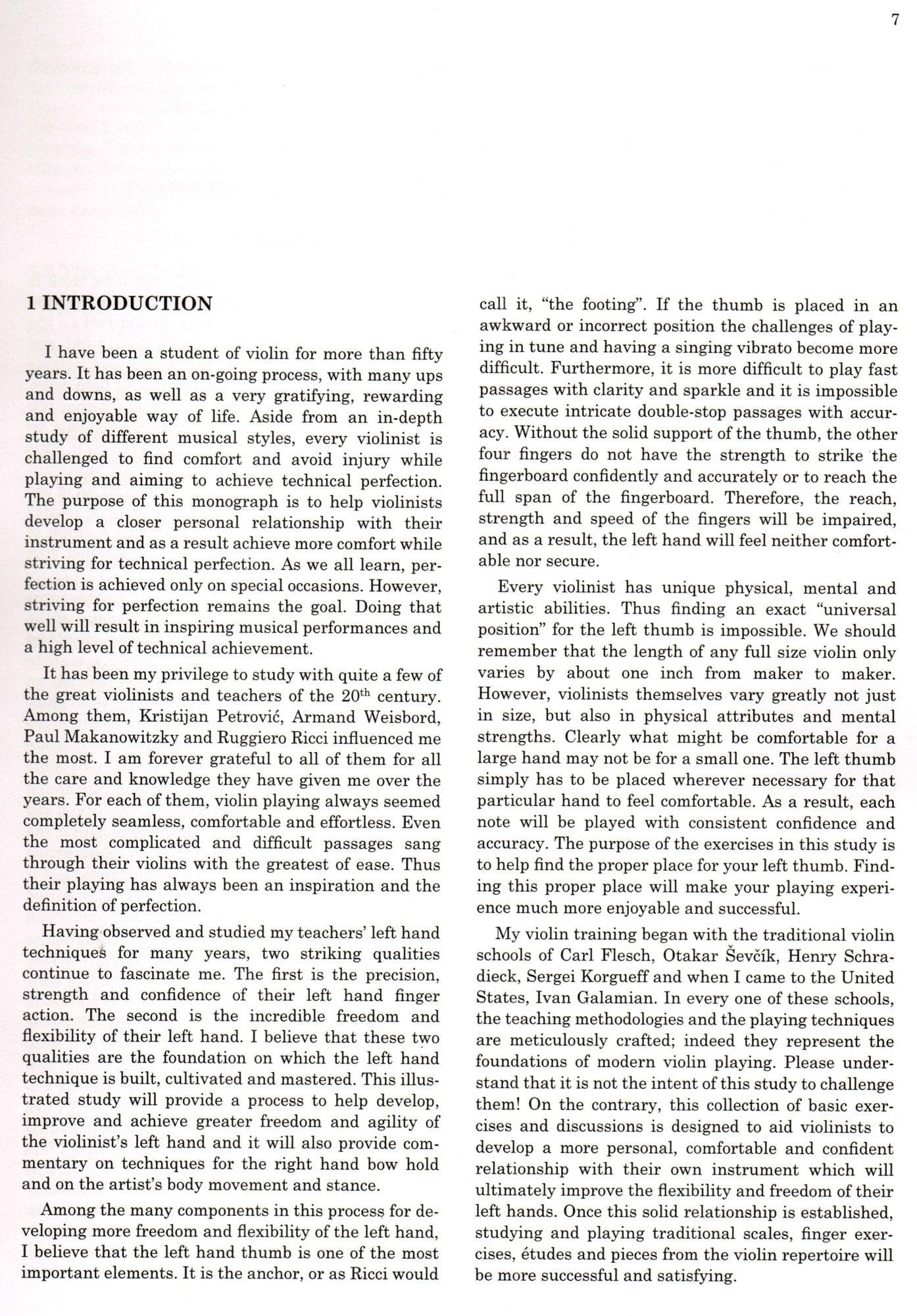 “[…] every violinist is challenged to find comfort and avoid injury while playing and aiming to achieve technical perfection. The purpose of this monograph is to help violinists develop a closer personal relationship with their instrument and as a result achieve more comfort while striving for technical perfection. […] Having observed and studied my teachers’ left hand techniques for many years, two striking qualities continue to fascinate me. The first is the precision, strength, and confidence of their left hand finger action. The second is the incredible freedom and flexibility of their left hand. […] this collection of basic exercises and discussions is designed to aid violinists to develop a more comfortable and confident relationship with their own instrument which will ultimately improve the flexibility and freedom of their left hands.”