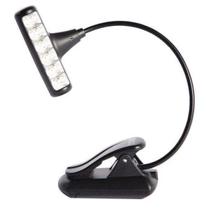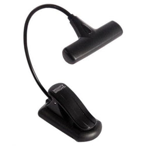 When you need more light, in a compact size, choose the new Hammerhead! Six bright energy efficient LED's in a 2 7/8 inch head will light one or two pages of music. Two brightness levels, flexible gooseneck and padded clip. Includes travel bag with belt loop and 3 AAA batteries, good for up to 9 hours of use. Optional AC adaptor available. Weighs only 2.1 oz to go anywhere!