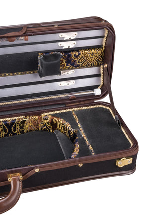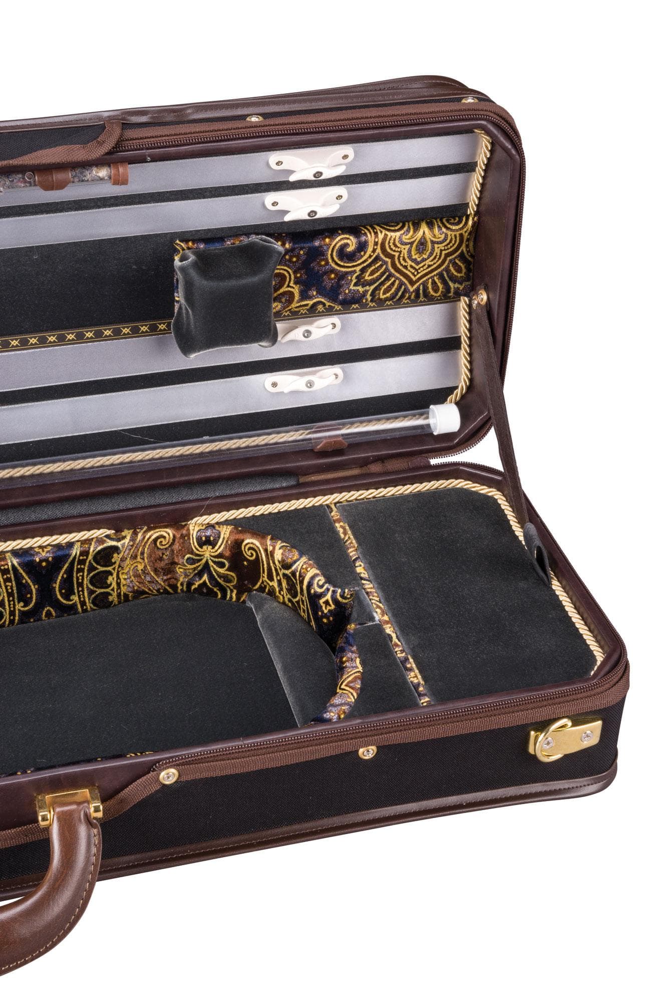 With all the same features of the Musafia Momentum, the Z Series offers colorful, bold, and stylish high-fashion interiors that will stand out in a crowd. Master case craftsman Dimitri Musafia has created the Musafia Momentum to the highest standards of Musafia quality, and in a much more compact and ultra-light package. With the violin centrally placed inside the Momentum, the resulting opening of space has created even more storage. And, this has been accomplished without compromising instrument safety, due to two structural load-bearing partitions integrated into Musafia's monolithic impact absorbing system. With all the features that Musafia cases are famous for: military-grade, Teflon treated Cordura black fabric cover with subway handle, suspension system, four bow holders, extra long vapor tube, deluxe analog hygrometer, hinged accessory compartments, shoulder rest holder, double-action Sekur safety lock, and finest quality European natural fabric interiors. Shar is pleased to offer the Musafia Momentum Z in a variety of fabric and color options.