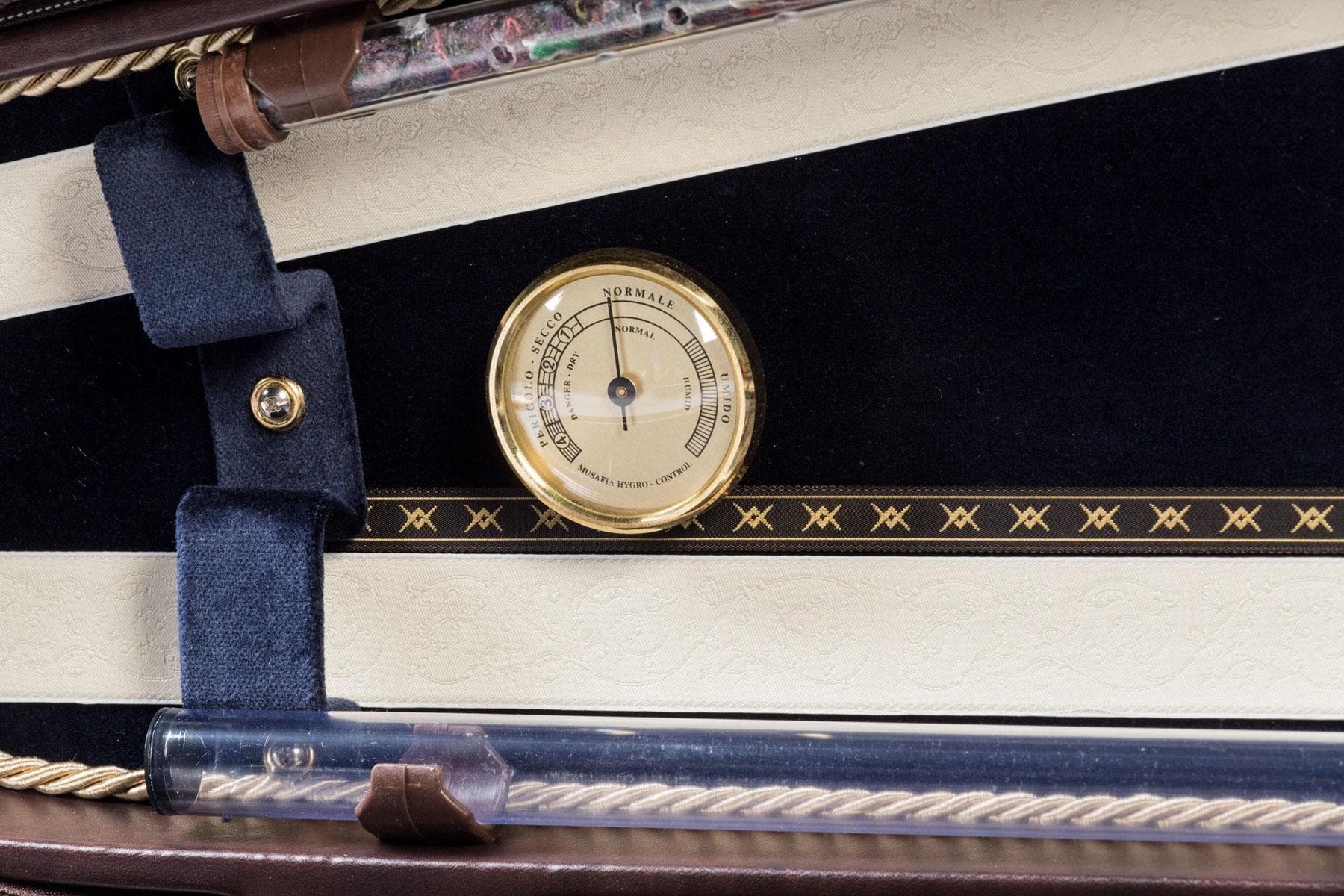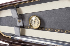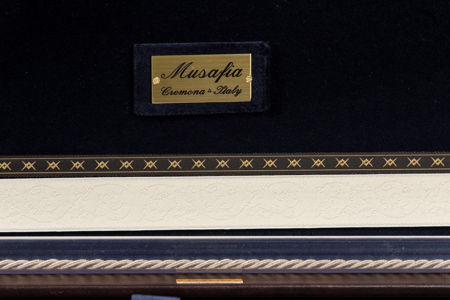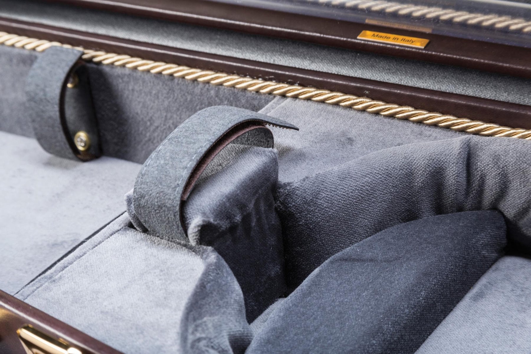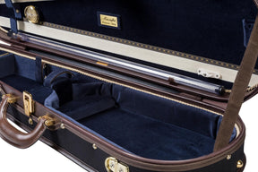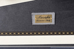 The safety and elegance of a Musafia case in a compact dart shape. Ample interior space for all your needs. Accessory compartment located on the left side. Interior fabric in dignified suede-like Royale fabric, in Pacific Blue, with military-grade, Teflon treated Cordura black fabric cover with subway handle.