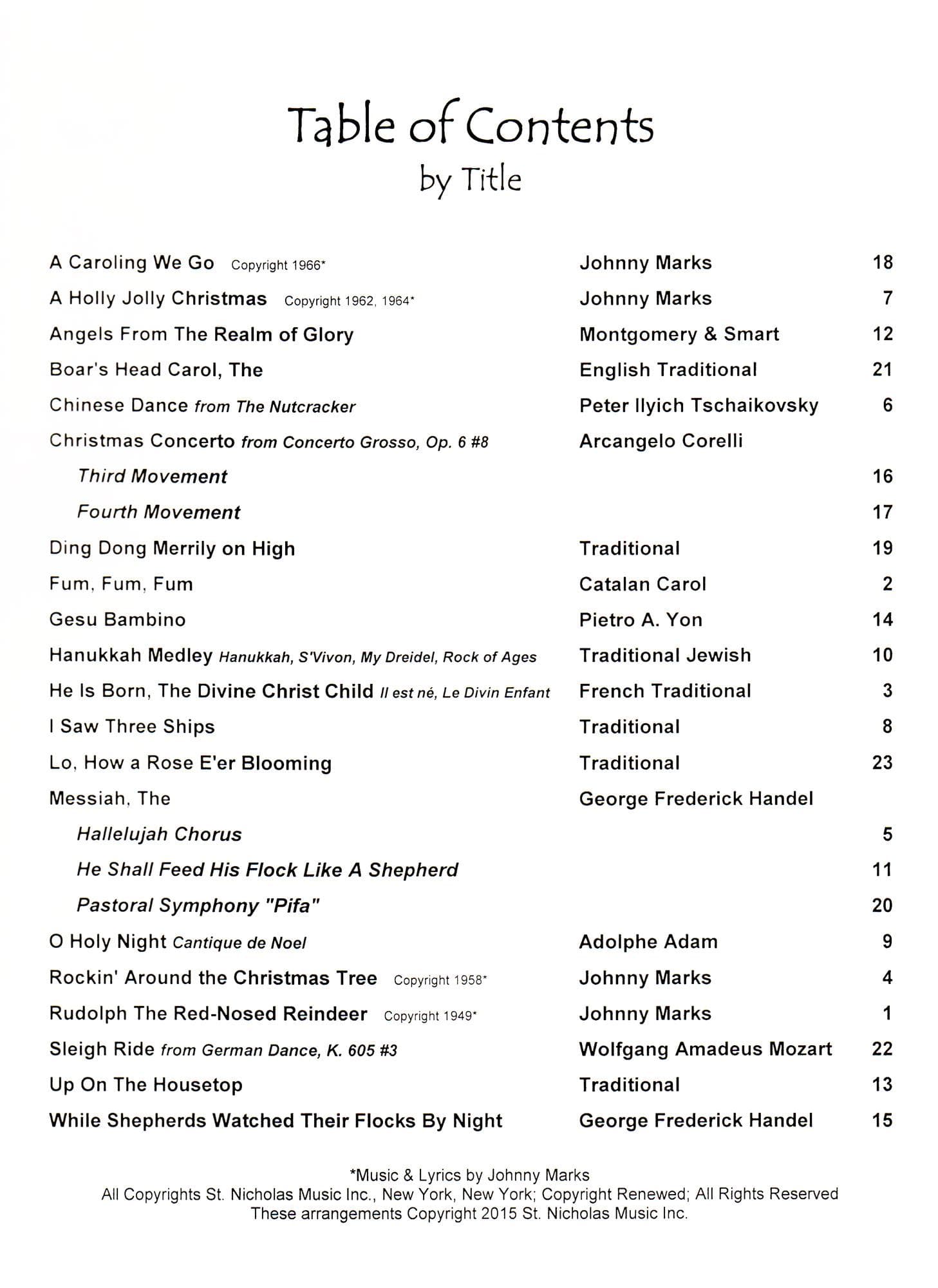 This book includes sheet music for two violins in score form of 23 popular and traditional holiday favorites that are perfect for holiday concerts, Christmas services, or entertainment. These arrangements by Daniel Kelly include: A Caroling We Go, A Holly Jolly Christmas, Angels From The Realm of Glory, The Boar's Dead Carol, Chinese Dance from the Nutcracker, Christmas Concerto by Corelli, Ding Dong Merrily on High, Fum Fum Fum, Gesu Bambino, Hanukkah Medley, He Is Born The Divine Christ Child, I Saw Three Ships, Lo How A Rose E'er Blooming, Hallelujah Chorus (from the Messiah), He Shall Feed His Flock Like A Shepherd (from the Messiah), Pastoral Symphony "Pifa" (from the Messiah), O Holy Night (Cantique de Noel), Rockin' Around The Christmas Tree, Rudolph the Red-Nosed Reindeer, Sleigh Ride from German Dance (Mozart), Up On The Housetop, and While Shepherds Watched Their Flocks By Night. These arrangements are written to still sound interesting for two instruments, which means they are a bit more advanced than some other intermediate level arrangements, but some are more accessible to progressing beginners.