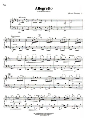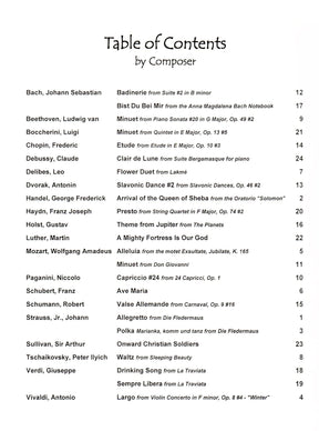 This book includes sheet music for violin and cello in score form of 24 classical works that are perfect for weddings or entertainment. These arrangements by Daniel Kelly include: Allegretto from Die Fledermaus (J. Strauss II), Alleluia from the motet Exsultate Jubilate (Mozart), Arrival of the Queen of Sheba (Handel), Ave Maria (Schubert), Badinerie (J.S. Bach), Bist Du Bei Mir from the Anna Magdalena Bach Notebook (J.S. Bach), Caprice #24 (Paganini), Clair de Lune (Debussy), Drinking Song from La Traviata (Verdi), Etude in E Major Opus 10 #3 (Chopin), Flower Duet (Delibes), Largo from Winter (Vivaldi), A Mighty Fortress is Our God (Luther), Minuet from Don Giovanni (Mozart), Minuet from Piano Sonata #20 (Beethoven), Minuet from Quintet in E Major (Boccherini), Onward Christian Soldiers (Sir Arthur Sullivan), Polka Marianka (J. Strauss II), Presto from String Quartet in F (Haydn), Sempre Libera from La Traviata (Verdi), Slavonic Dance #2 (Dvorak), Theme from Jupiter (Holst), Valse Allemande from Carnaval (Schumann), and Waltz from Sleeping Beauty (Tchaikovsky). These arrangements are written to still sound interesting for two instruments, which means they are a bit more advanced than some other intermediate level arrangements.