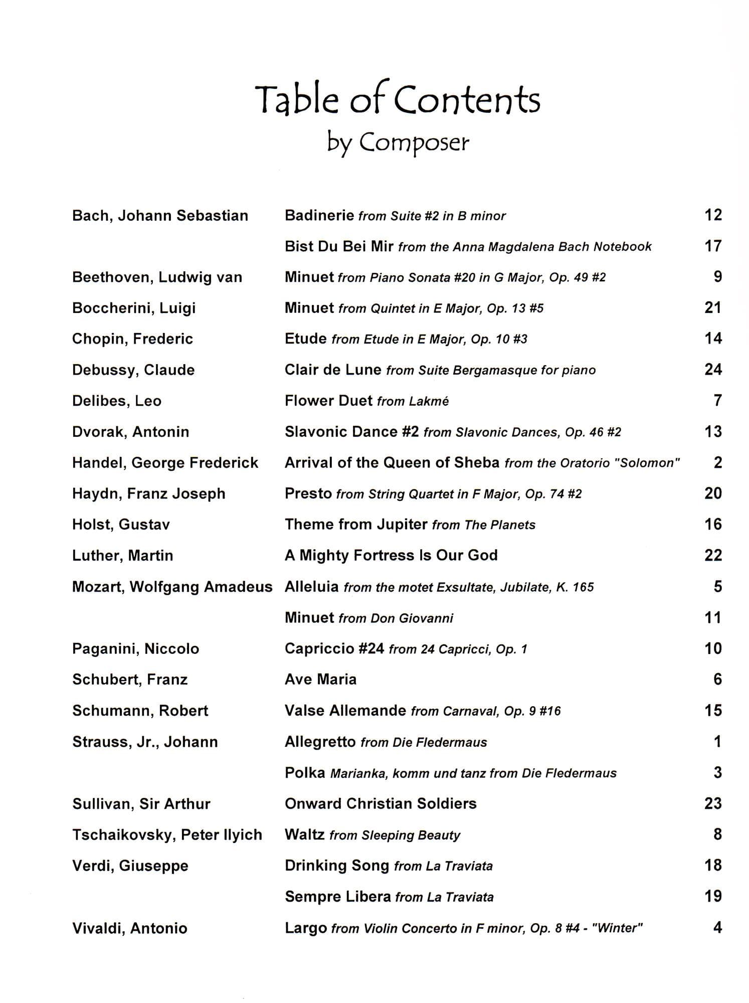 This book includes sheet music for two violins in score form of 24 classical works that are perfect for weddings or entertainment. These arrangements by Daniel Kelly include: Allegretto from Die Fledermaus (J. Strauss II), Alleluia from the motet Exsultate Jubilate (Mozart), Arrival of the Queen of Sheba (Handel), Ave Maria (Schubert), Badinerie (J.S. Bach), Bist Du Bei Mir from the Anna Magdalena Bach Notebook (J.S. Bach), Caprice #24 (Paganini), Clair de Lune (Debussy), Drinking Song from La Traviata (Verdi), Etude in E Major Opus 10 #3 (Chopin), Flower Duet (Delibes), Largo from Winter (Vivaldi), A Mighty Fortress is Our God (Luther), Minuet from Don Giovanni (Mozart), Minuet from Piano Sonata #20 (Beethoven), Minuet from Quintet in E Major (Boccherini), Onward Christian Soldiers (Sir Arthur Sullivan), Polka Marianka (J. Strauss II), Presto from String Quartet in F (Haydn), Sempre Libera from La Traviata (Verdi), Slavonic Dance #2 (Dvorak), Theme from Jupiter (Holst), Valse Allemande from Carnaval (Schumann), and Waltz from Sleeping Beauty (Tchaikovsky). These arrangements are written to still sound interesting for two instruments, which means they are a bit more advanced than some other intermediate level arrangements.