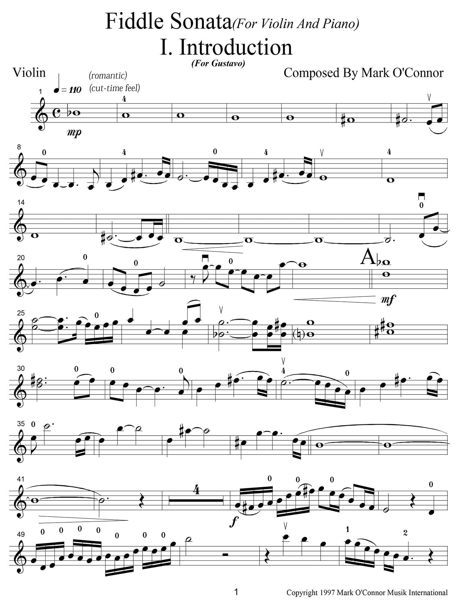 Fiddle Sonata for violin and piano composed by Mark O'Connor was a commission from the Library Of Congress in Washington D.C. It premiered in Jefferson Hall during their prestigious '97-'98 chamber music season. The Library was featuring piano in their programming that year, therefore requesting O'Connor to compose utilizing the instrument. The premier was broadcast on NPR's "Performance Today" and was also the centerpiece for a national public radio special "America's Fiddler, Mark O'Connor at the Library Of Congress".