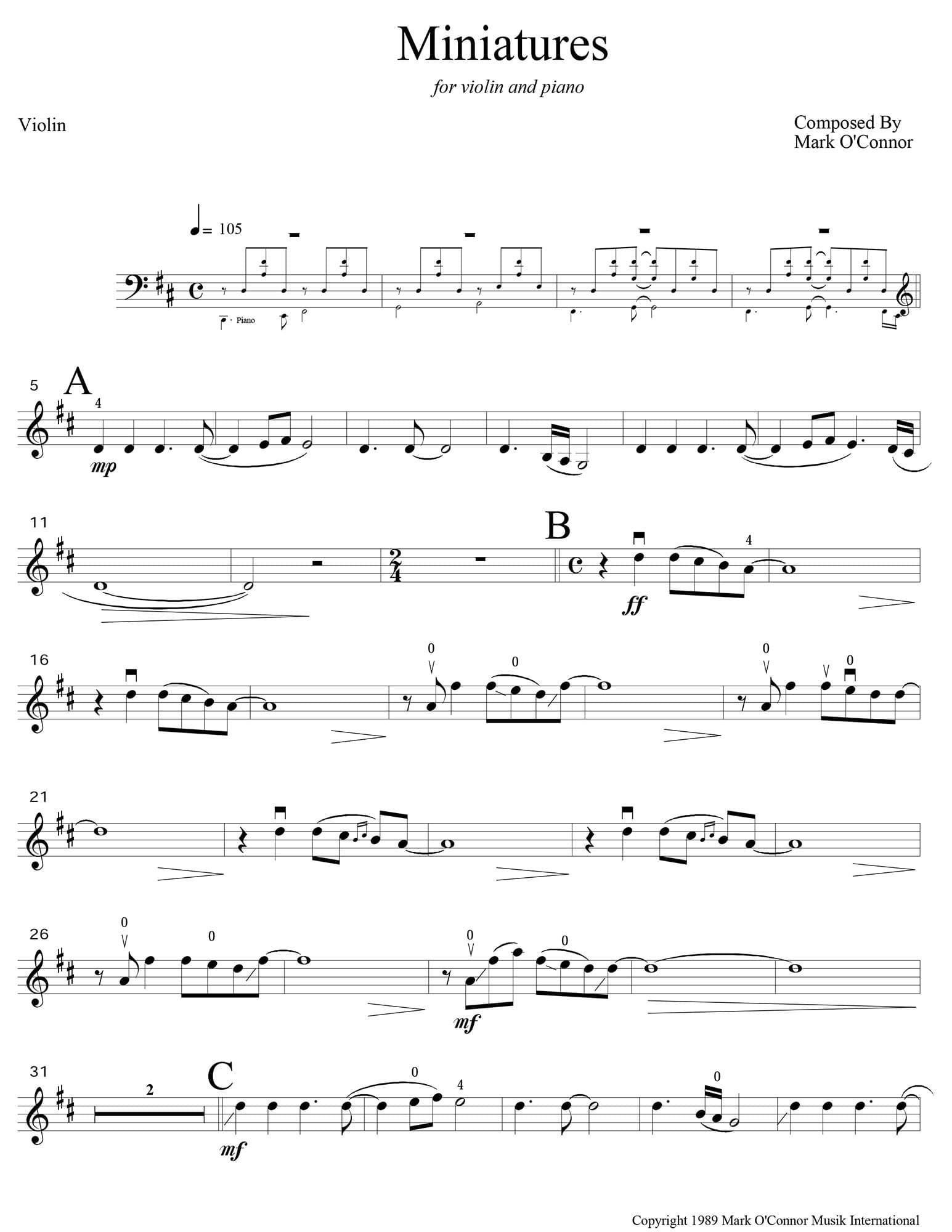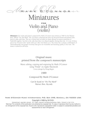 Miniatures (for violin and piano) composed by Mark OConnor was written in 1989 for his Warner Bros. Album "On The Mark." Mr. OConnor composed the piece for his good friend and pianist John Jarvis to play with him. The two of them had recorded on many albums as session musicians in Nashville together, but this is the only duet they ever played together during that time. It is one of those pieces by OConnor that "sticks with you" after one listens to it. The music has a unique combination of classical/popular and gospel overtones that gives an irresistible and haunting quality to the tune.