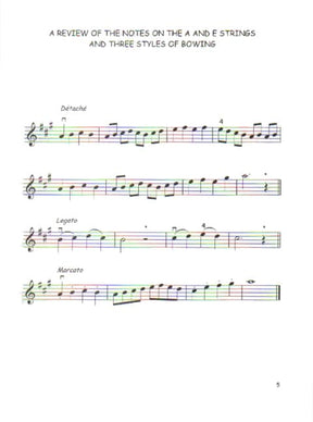 In BOOKS I and II, the student is systematically introduced to the notes on each string, using all the fingers to create a tetrachord. Fingering appears on the first page of a new note, and later only as needed. All etudes and songs are within a one-octave range, thus requiring the use one pattern, the Basic Finger Pattern. Quarter, half, and eighth notes are introduced in rhythmic-verbal terms such as "walk" and "running", rather than with numbers. This eliminates confusion over fingering vs. rhythm. Learning the letter names for the notes is reserved until the student is reading the music with ease, and is accomplished in one simple lesson. Finger Pattern Charts appear on appropriate pages as guides.