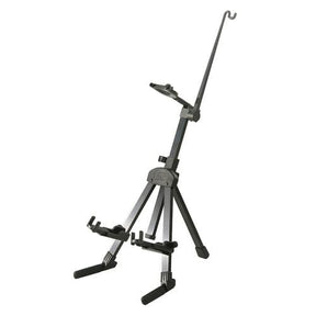 From the makers of the popular Peak Music Stands comes this easy to use instrument stand. Sets up in seconds and fits into the included easy to carry bag so you can bring it with you to rehearsal locations. Aluminum legs provide stability while rubberized supports protect your violin from scratches. Height can be adjusted to fit all violins and violas. Includes extendable bow holder.