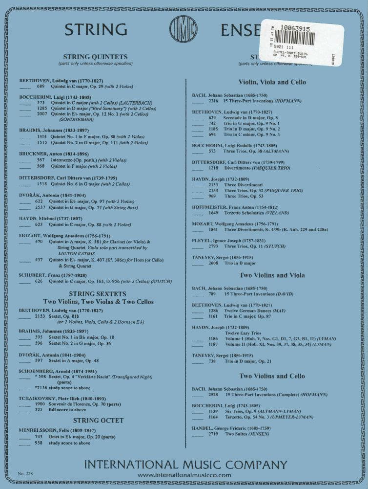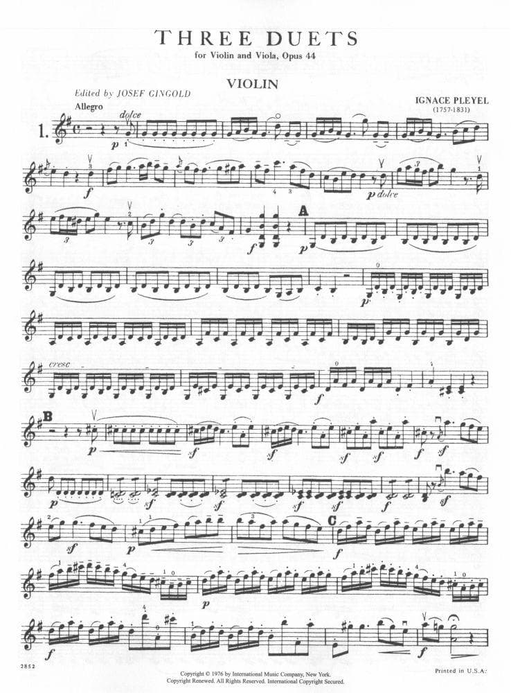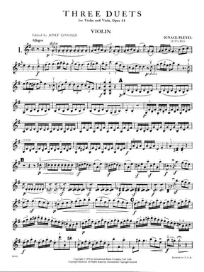 Pleyel, Ignace Joseph - Three Duets, Op 44, B 529-531 - Violin and Viola - edited by Josef Gingold - International Music Company